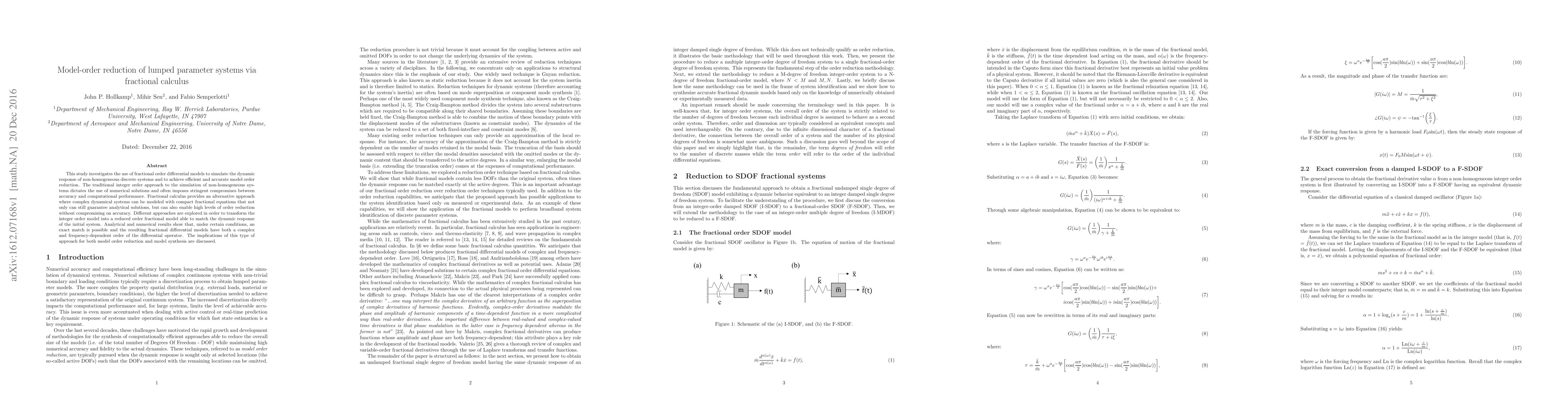 This study investigates the use of fractional order differential models to simulate the dynamic response of non-homogeneous discrete systems and to achieve efficient and accurate model order reduction. The traditional integer order approach to the simulation of non-homogeneous systems dictates the use of numerical solutions and often imposes stringent compromises between accuracy and computational performance. Fractional calculus provides an alternative approach where complex dynamical systems can be modeled with compact fractional equations that not only can still guarantee analytical solutions, but can also enable high levels of order reduction without compromising on accuracy. Different approaches are explored in order to transform the integer order model into a reduced order fractional model able to match the dynamic response of the initial system. Analytical and numerical results show that, under certain conditions, an exact match is possible and the resulting fractional differential models have both a complex and frequency-dependent order of the differential operator. The implications of this type of approach for both model order reduction and model synthesis are discussed.