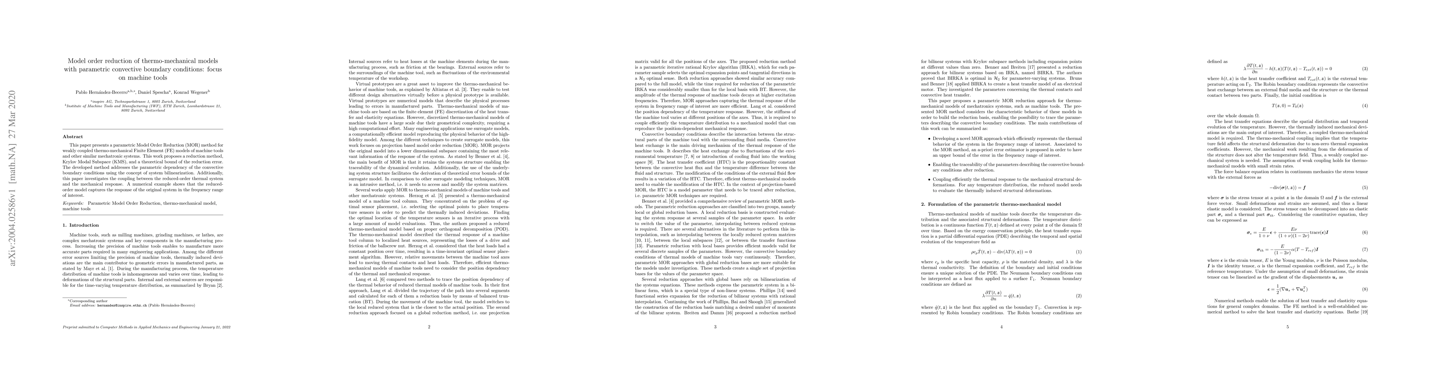 This paper introduces a Model Order Reduction (MOR) method for thermo-mechanical machine tool models, using Krylov Modal Subspace (KMS) and addressing parametric convective boundary conditions through system bilinearization. The method's accuracy is supported by a theoretical error bound, demonstrated with a numerical example showing the reduced-order model's effectiveness in capturing original system responses within the relevant frequency range.