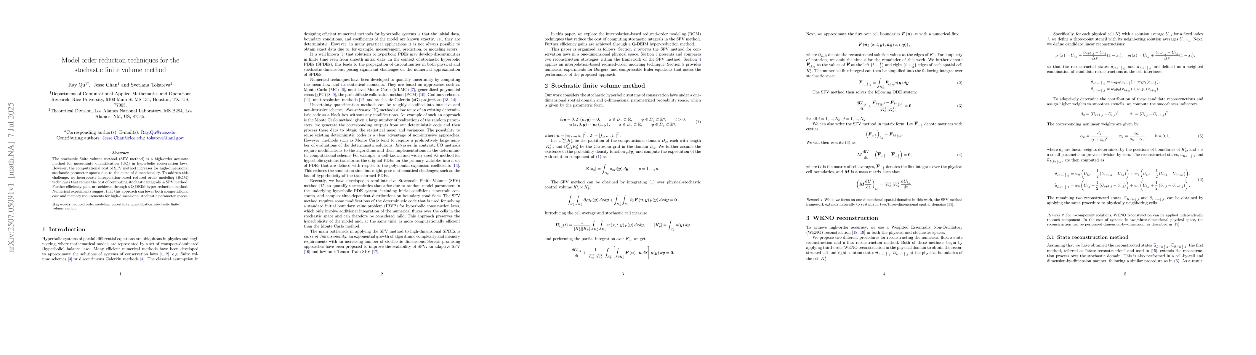 The stochastic finite volume method (SFV method) is a high-order accurate method for uncertainty quantification (UQ) in hyperbolic conservation laws. However, the computational cost of SFV method increases for high-dimensional stochastic parameter spaces due to the curse of dimensionality. To address this challenge, we incorporate interpolation-based reduced order modeling (ROM) techniques that reduce the cost of computing stochastic integrals in SFV method. Further efficiency gains are achieved through a Q-DEIM hyper-reduction method. Numerical experiments suggest that this approach can lower both computational cost and memory requirements for high-dimensional stochastic parameter spaces.