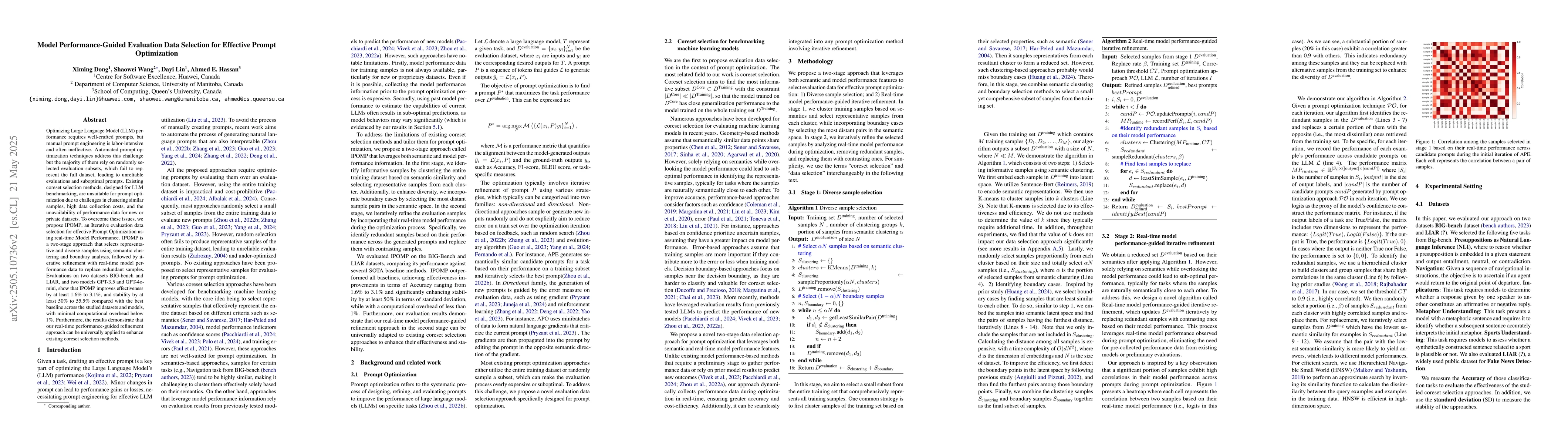 The research proposes IPOMP, a two-stage approach for automated prompt optimization using iterative evaluation data selection guided by real-time model performance. It involves semantic clustering and boundary analysis for initial sample selection, followed by iterative refinement to replace redundant samples.