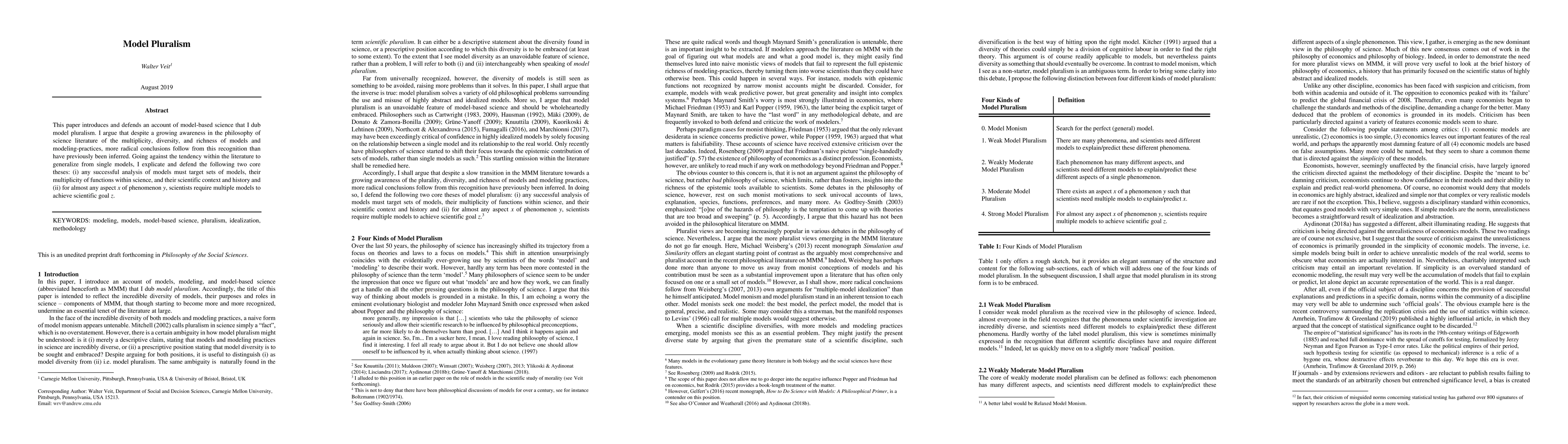 Title: Model Pluralism Summary: This paper advocates for model pluralism, arguing that scientific analysis should focus on sets of models and their diverse functions within science. It posits that multiple models are necessary to achieve comprehensive scientific understanding of any phenomenon.