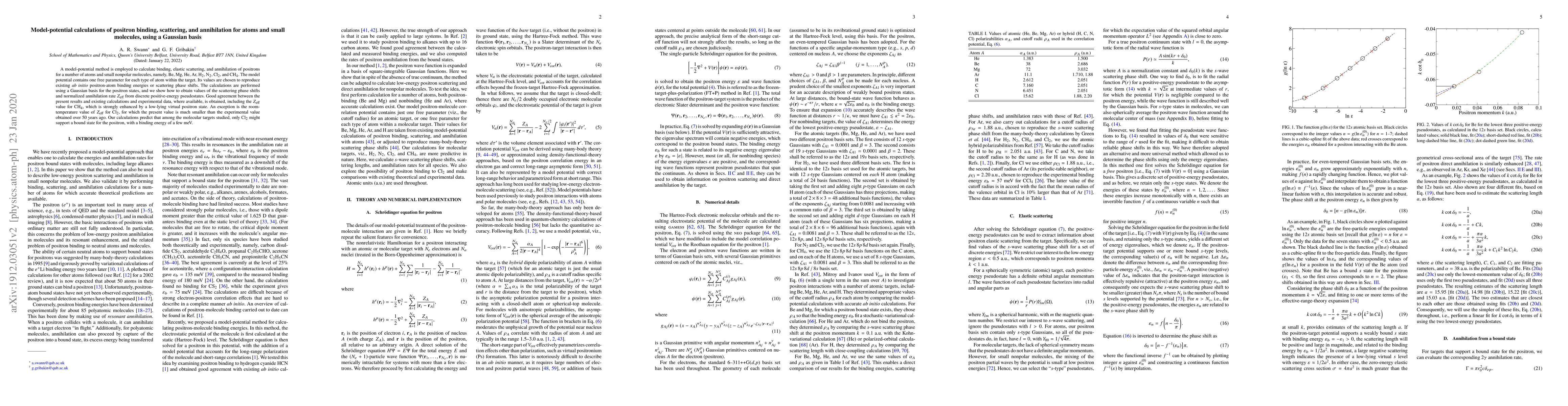 A model-potential method is employed to calculate binding, elastic scattering, and annihilation of positrons for a number of atoms and small nonpolar molecules, namely, Be, Mg, He, Ar, H$_2$, N$_2$, Cl$_2$, and CH$_4$. The model potential contains one free parameter for each type of atom within the target. Its values are chosen to reproduce existing ab initio positron-atom binding energies or scattering phase shifts. The calculations are performed using a Gaussian basis for the positron states, and we show how to obtain values of the scattering phase shifts and normalized annihilation rate $Z_{\rm eff}$ from discrete positive-energy pseudostates. Good agreement between the present results and existing calculations and experimental data, where available, is obtained, including the $Z_{\rm eff}$ value for CH$_4$, which is strongly enhanced by a low-lying virtual positron state. An exception is the room-temperature value of $Z_{\rm eff}$ for Cl$_2$, for which the present value is much smaller than the experimental value obtained over 50 years ago. Our calculations predict that among the molecular targets studied, only Cl$_2$ might support a bound state for the positron, with a binding energy of a few meV.