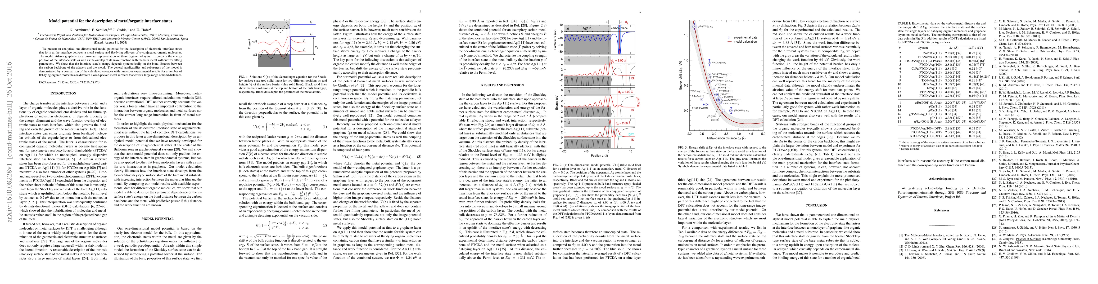 This paper introduces a one-dimensional analytical model to describe electronic interface states at metal/organic interfaces, using graphene as a representation of organic adlayers. The model predicts interface state energies and wave function overlaps without free parameters, showing systematic dependence on bond distances and validated by experimental comparisons.