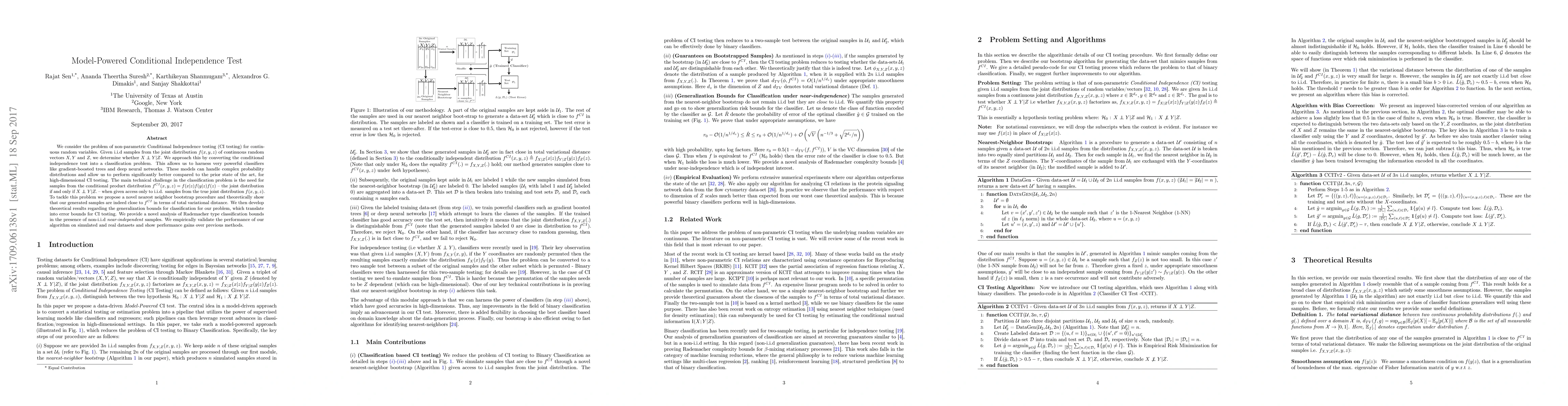 This paper proposes a novel method for non-parametric conditional independence testing using powerful classifiers like gradient-boosted trees and deep neural networks, transforming the problem into a classification task. The authors introduce a nearest neighbor bootstrap procedure to generate samples from the conditional product distribution, demonstrating theoretical closeness and generalization bounds, and showing improved performance over prior methods.