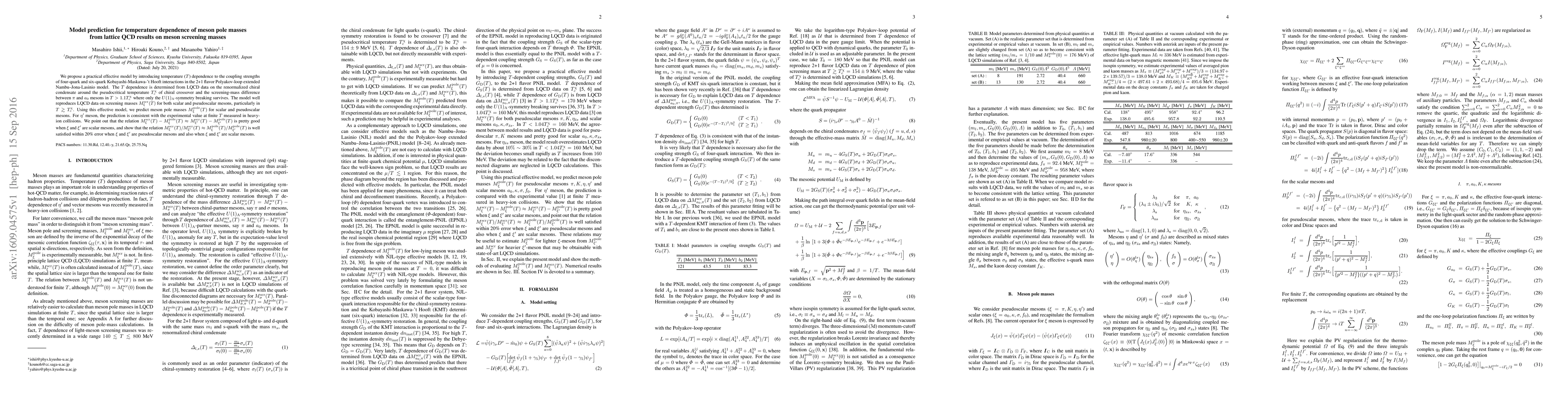 This paper proposes an effective model incorporating temperature dependence into the coupling strengths of four-quark and six-quark interactions in the Polyakov-loop extended Nambu-Jona-Lasinio model. The model accurately reproduces lattice QCD data on meson screening masses and predicts meson pole masses, showing good consistency with experimental values.