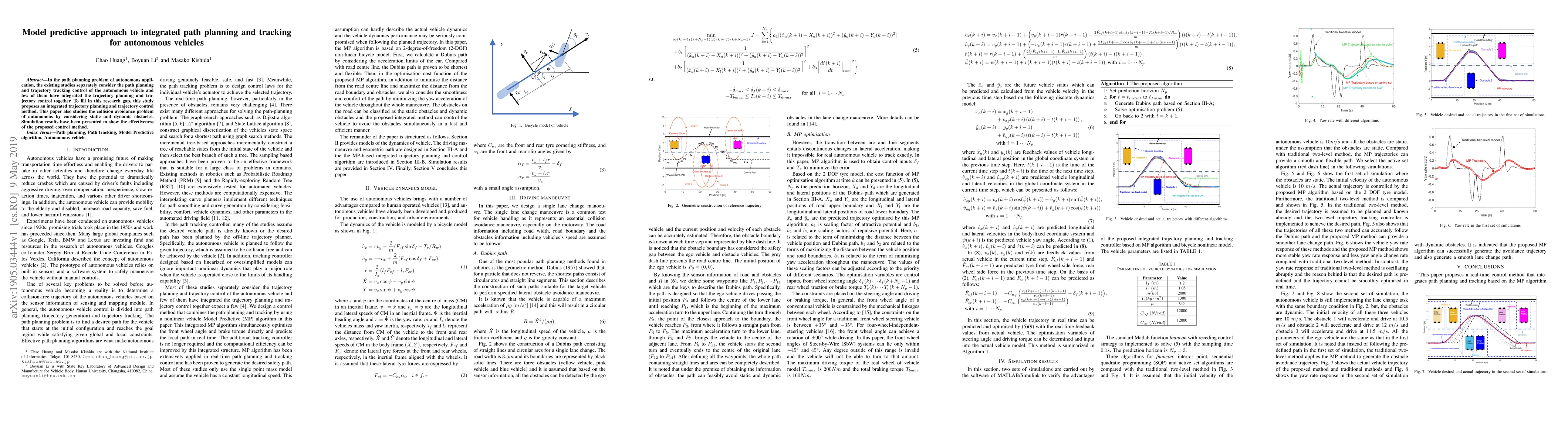 The paper presents a novel integrated path planning and tracking control method for autonomous vehicles using Model Predictive Control (MPC) based on a 2-DOF nonlinear bicycle model, addressing both static and dynamic obstacles in a single lane change maneuver.