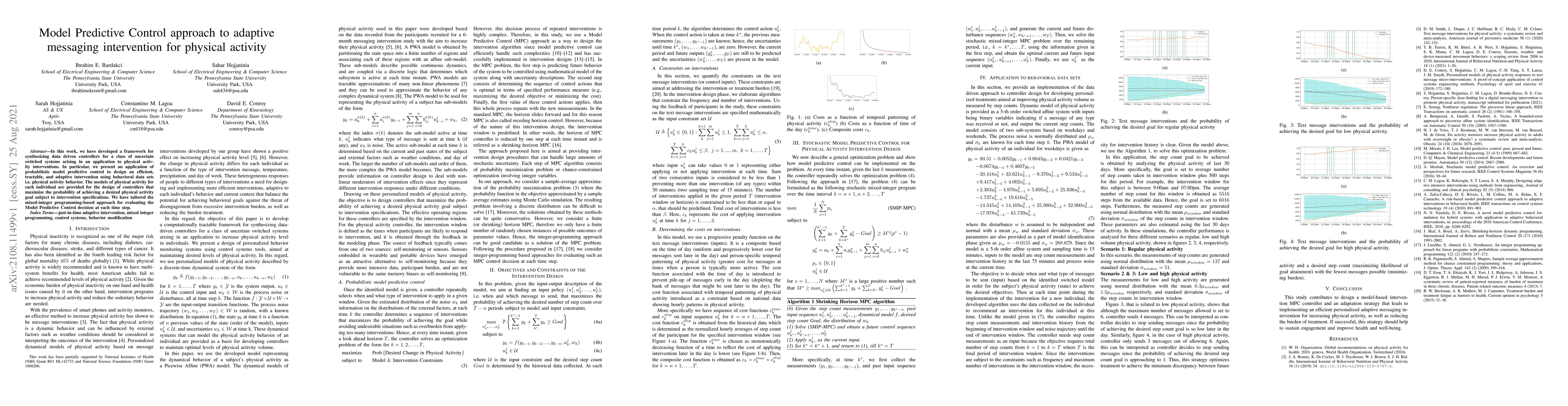 In this work, we have developed a framework for synthesizing data driven controllers for a class of uncertain switched systems arising in an application to physical activity interventions. In particular, we present an application of probabilistic model predictive control to design an efficient, tractable, and adaptive intervention using behavioral data sets i.e. physical activity behavior. The models of physical activity for each individual are provided for the design of controllers that maximize the probability of achieving a desired physical activity goal subject to intervention specifications. We have tailored the mixed-integer programming-based approach for evaluating the Model Predictive Control decision at each time step.