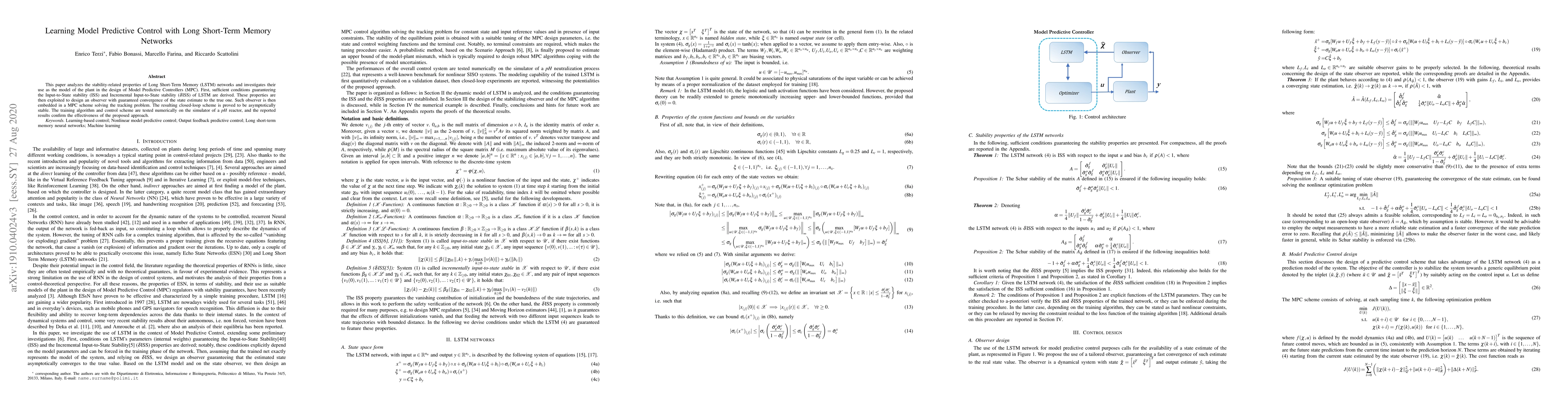 This paper proposes a method for designing Model Predictive Controllers using Long Short-Term Memory networks, ensuring stability and convergence of the state estimate, with successful application to a pH reactor simulator.