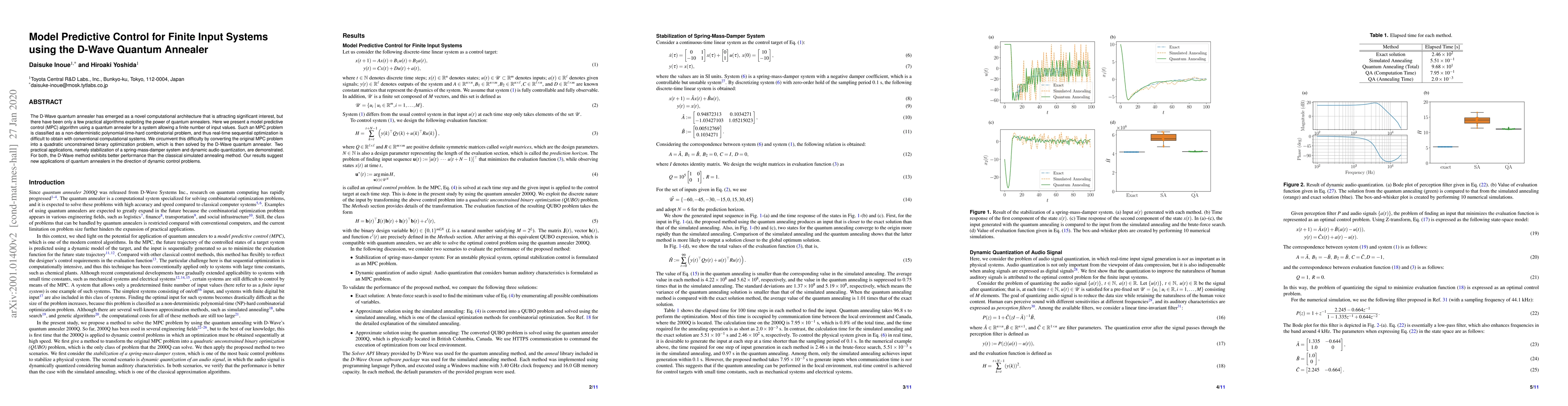 This paper presents a model predictive control algorithm using the D-Wave quantum annealer for systems with finite input values, transforming the problem into a quadratic unconstrained binary optimization problem. The D-Wave method outperforms classical simulated annealing in stabilizing a spring-mass-damper system and dynamic audio quantization.