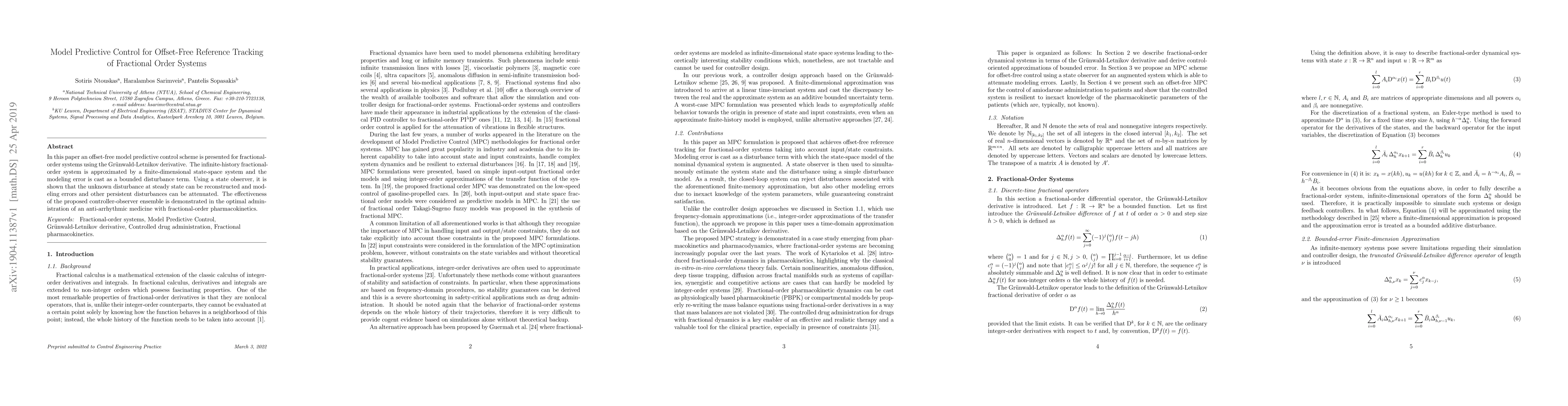 This paper proposes an offset-free model predictive control scheme for fractional-order systems using the Grünwald-Letnikov derivative, approximating infinite-history systems with finite-dimensional models. The controller-observer ensemble effectively reconstructs unknown disturbances and attenuates modeling errors, demonstrated through optimal administration of anti-arrhythmic medicine.