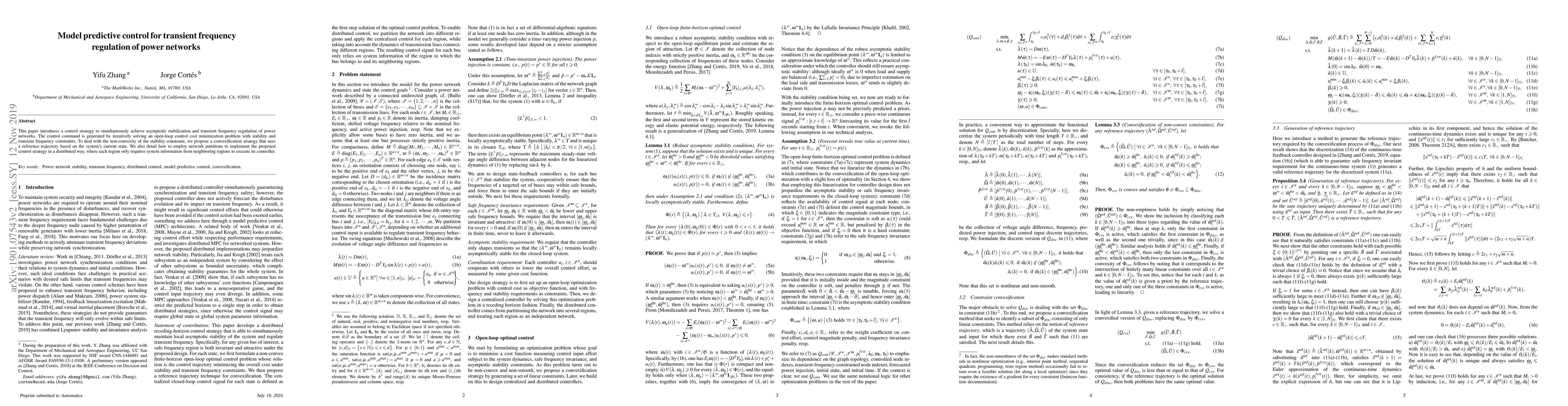 This paper proposes a model predictive control strategy for stabilizing and regulating transient frequency in power networks, utilizing a convexification approach to handle stability constraints and enabling distributed implementation via network partitions. The control commands are generated by solving an open-loop optimization problem iteratively.