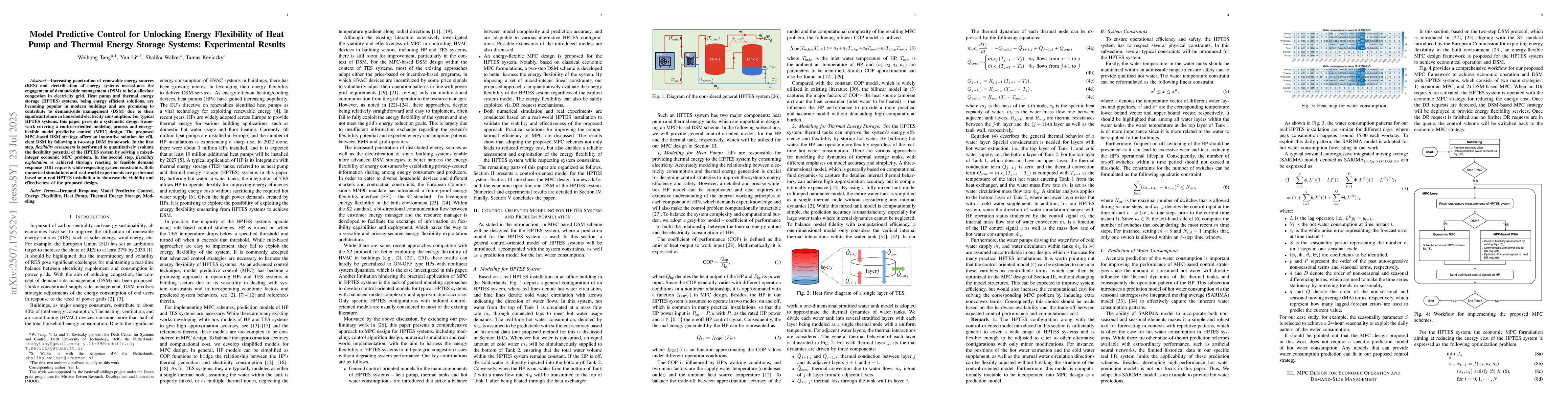 Increasing penetration of renewable energy sources (RES) and electrification of energy systems necessitates the engagement of demand-side management (DSM) to help alleviate congestion in electricity grid. Heat pump and thermal energy storage (HPTES) systems, being energy efficient solutions, are becoming popular in modern buildings and are promising to contribute to demand-side management (DSM) due to their significant share in household electricity consumption. For typical HPTES systems, this paper presents a systematic design framework covering a control-oriented modeling process and energy-flexible model predictive control (MPC) design. The proposed MPC-based DSM strategy offers an innovative solution for efficient DSM by following a two-step DSM framework. In the first step, flexibility assessment is performed to quantitatively evaluate the flexibility potential of the HPTES system by solving a mixed-integer economic MPC problem. In the second step, flexibility exploitation is achieved through reacting to feasible demand response (DR) requests while respecting system constraints. Both numerical simulations and real-world experiments are performed based on a real HPTES installation to showcase the viability and effectiveness of the proposed design.