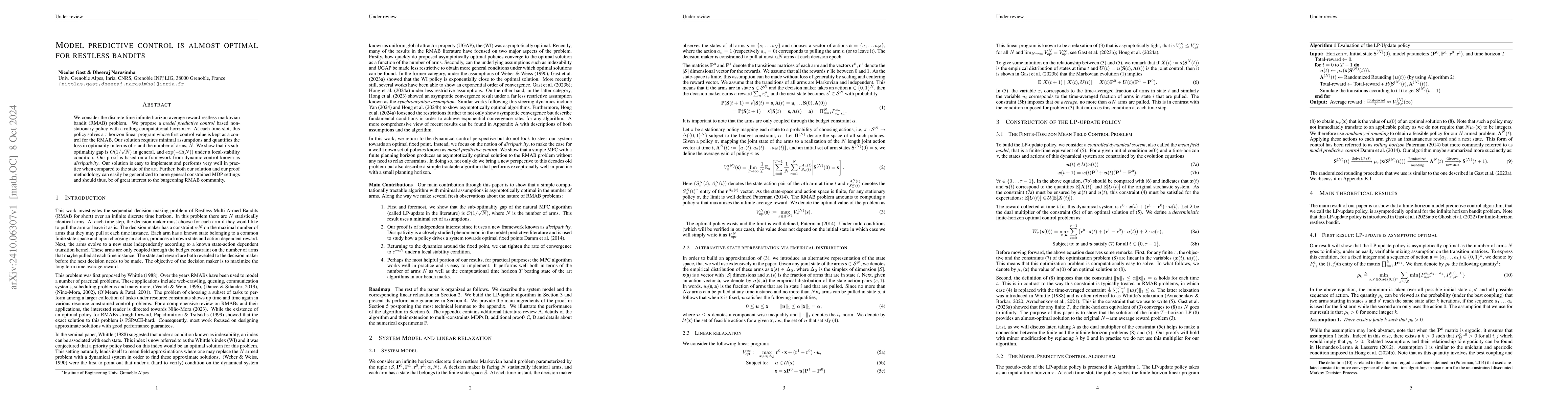 We consider the discrete time infinite horizon average reward restless markovian bandit (RMAB) problem. We propose a \emph{model predictive control} based non-stationary policy with a rolling computational horizon $\tau$. At each time-slot, this policy solves a $\tau$ horizon linear program whose first control value is kept as a control for the RMAB. Our solution requires minimal assumptions and quantifies the loss in optimality in terms of $\tau$ and the number of arms, $N$. We show that its sub-optimality gap is $O(1/\sqrt{N})$ in general, and $\exp(-\Omega(N))$ under a local-stability condition. Our proof is based on a framework from dynamic control known as \emph{dissipativity}. Our solution easy to implement and performs very well in practice when compared to the state of the art. Further, both our solution and our proof methodology can easily be generalized to more general constrained MDP settings and should thus, be of great interest to the burgeoning RMAB community.