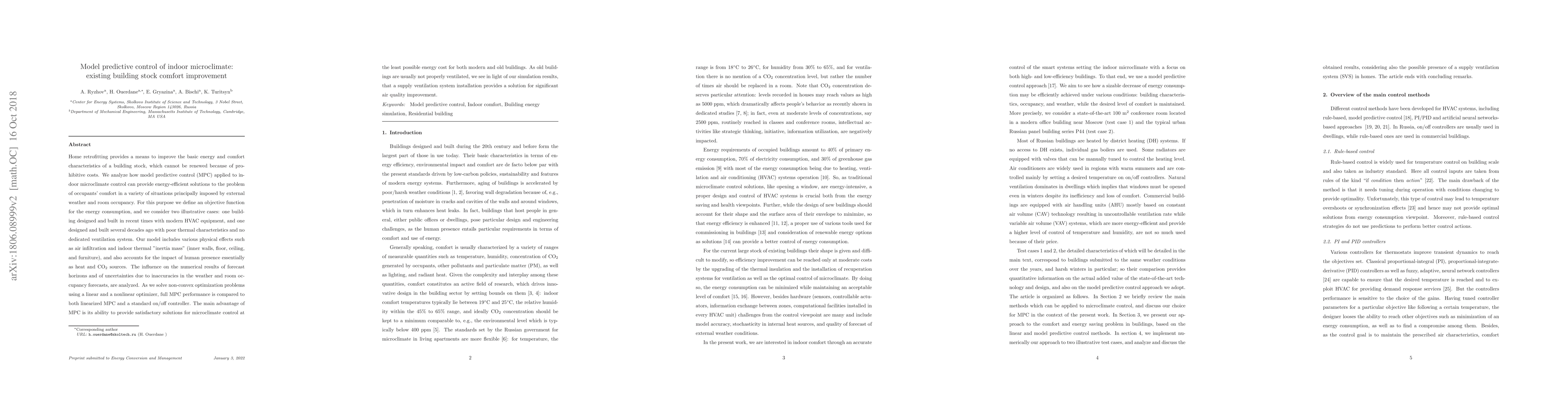 This paper explores the use of model predictive control (MPC) to enhance indoor microclimate and comfort in existing buildings through retrofitting. It compares MPC performance against linearized MPC and on/off controllers, demonstrating its effectiveness in optimizing energy use while maintaining occupant comfort, especially in older buildings with poor ventilation.