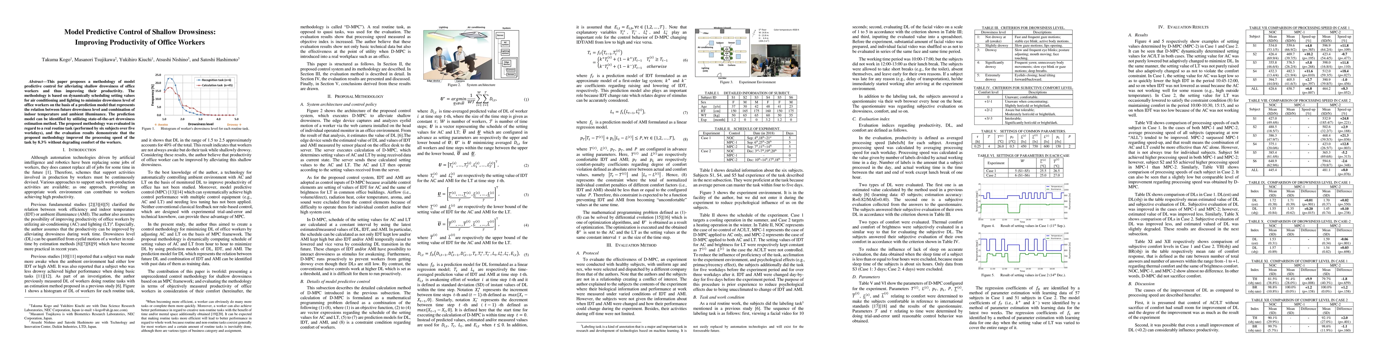 This paper introduces a model predictive control methodology to reduce shallow drowsiness among office workers, thereby enhancing productivity through dynamic adjustments of air conditioning and lighting. Evaluations show an 8.3% improvement in task processing speed without compromising worker comfort.