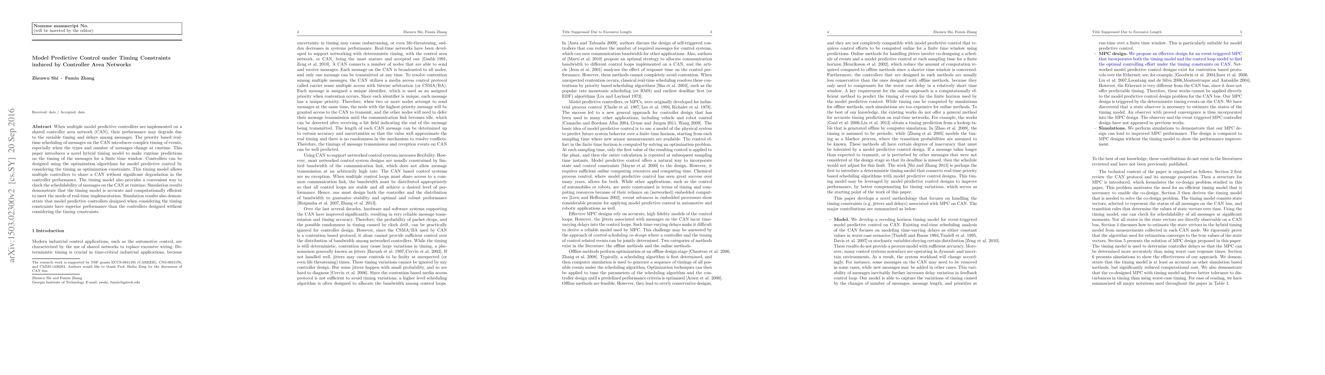 When multiple model predictive controllers are implemented on a shared control area network (CAN), their performance may degrade due to the inhomogeneous timing and delays among messages. The priority based real-time scheduling of messages on the CAN introduces complex timing of events, especially when the types and number of messages change at runtime. This paper introduces a novel hybrid timing model to make runtime predictions on the timing of the messages for a finite time window. Controllers can be designed using the optimization algorithms for model predictive control by considering the timing as optimization constraints. This timing model allows multiple controllers to share a CAN without significant degradation in the controller performance. The timing model also provides a convenient way to check the schedulability of messages on the CAN at runtime. Simulation results demonstrate that the timing model is accurate and computationally efficient to meet the needs of real-time implementation. Simulation results also demonstrate that model predictive controllers designed when considering the timing constraints have superior performance than the controllers designed without considering the timing constraints.
