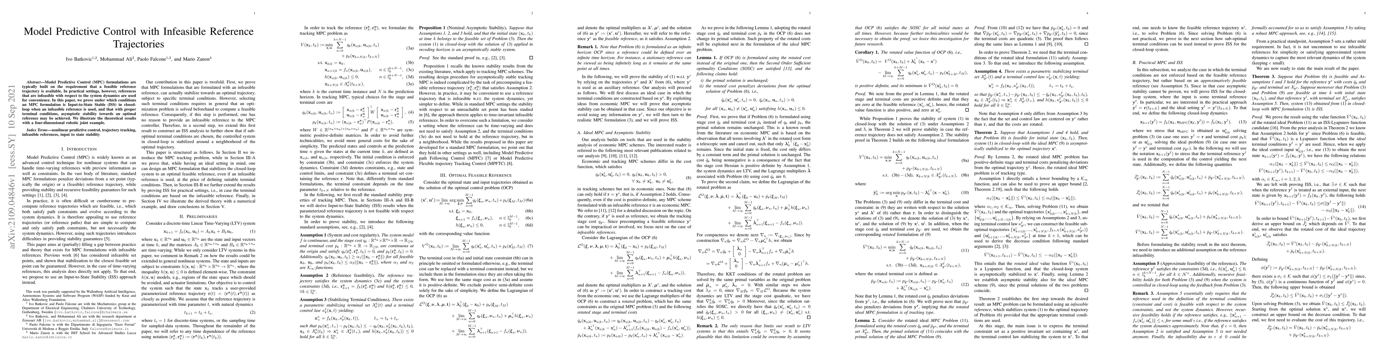 Researchers show that Model Predictive Control can achieve asymptotic stability with infeasible reference trajectories under certain conditions, and that proper terminal conditions can lead to optimal performance.