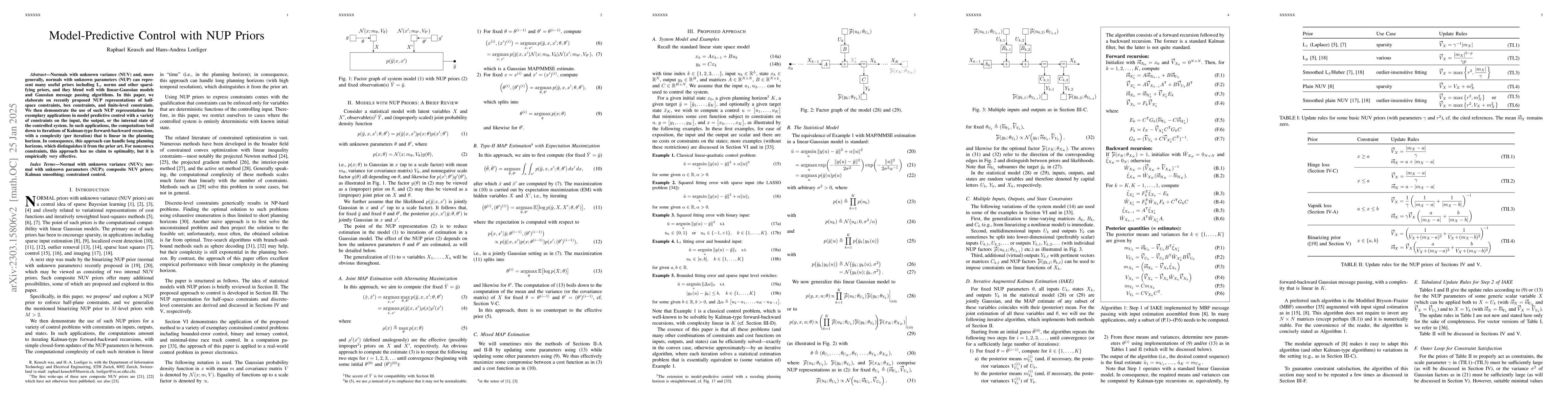 Normals with unknown variance (NUV) can represent many useful priors including $L_p$ norms and other sparsifying priors, and they blend well with linear-Gaussian models and Gaussian message passing algorithms. In this paper, we elaborate on recently proposed discretizing NUV priors, and we propose new NUV representations of half-space constraints and box constraints. We then demonstrate the use of such NUV representations with exemplary applications in model predictive control, with a variety of constraints on the input, the output, or the internal stateof the controlled system. In such applications, the computations boil down to iterations of Kalman-type forward-backward recursions, with a complexity (per iteration) that is linear in the planning horizon. In consequence, this approach can handle long planning horizons, which distinguishes it from the prior art. For nonconvex constraints, this approach has no claim to optimality, but it is empirically very effective.