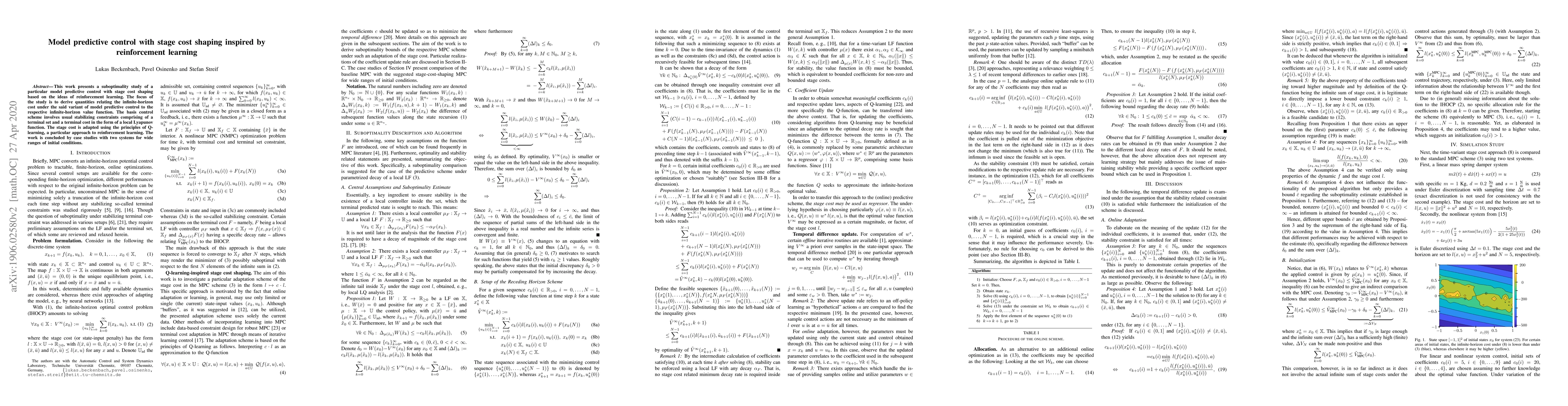 This paper investigates a model predictive control method incorporating stage cost shaping inspired by reinforcement learning, specifically Q-learning. The study derives relationships between the infinite-horizon cost function and the value function, concluding with case studies demonstrating the method's effectiveness across various initial conditions.