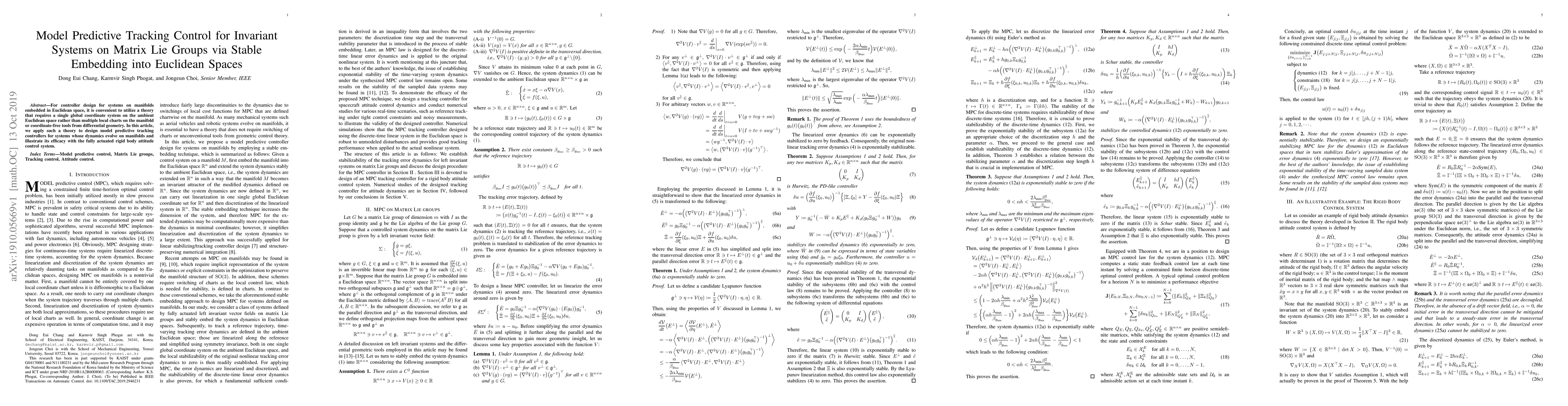 For controller design for systems on manifolds embedded in Euclidean space, it is convenient to utilize a theory that requires a single global coordinate system on the ambient Euclidean space rather than multiple local charts on the manifold or coordinate-free tools from differential geometry. In this article, we apply such a theory to design model predictive tracking controllers for systems whose dynamics evolve on manifolds and illustrate its efficacy with the fully actuated rigid body attitude control system.