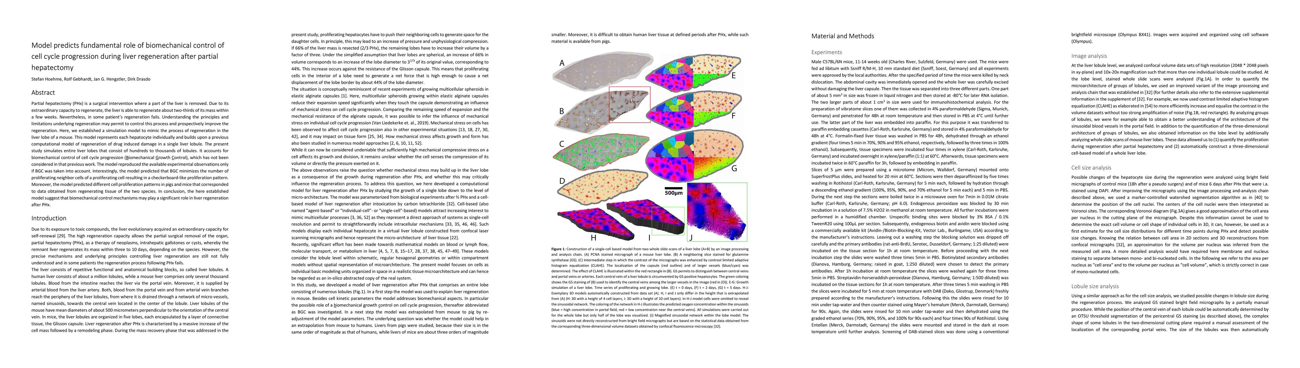 This study developed a simulation model to predict liver regeneration after partial hepatectomy, emphasizing the biomechanical control of cell cycle progression. The model accurately reproduced experimental observations and predicted a checkerboard-like proliferation pattern, highlighting the significance of biomechanical control in liver regeneration.