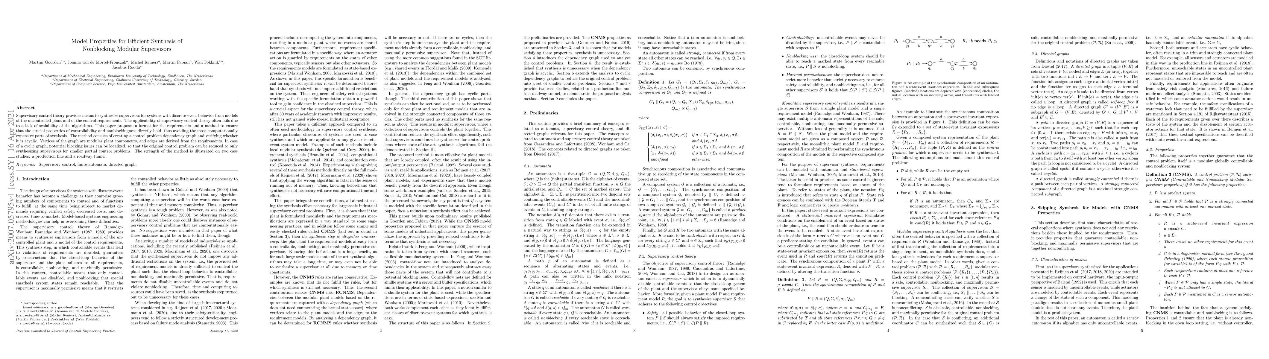 Supervisory control theory provides means to synthesize supervisors for systems with discrete-event behavior from models of the uncontrolled plant and of the control requirements. The applicability of supervisory control theory often fails due to a lack of scalability of the algorithms. The paper proposes a format for the requirements and a method to ensure that the crucial properties of controllability and nonblockingness directly hold, thus avoiding the most computationally expensive parts of synthesis. The method consists of creating a control problem dependency graph and verifying whether it is acyclic. Vertices of the graph are modular plant components, and edges are derived from the requirements. In case of a cyclic graph, potential blocking issues can be localized, so that the original control problem can be reduced to only synthesizing supervisors for smaller partial control problems. The strength of the method is illustrated on two case studies: a production line and a roadway tunnel.