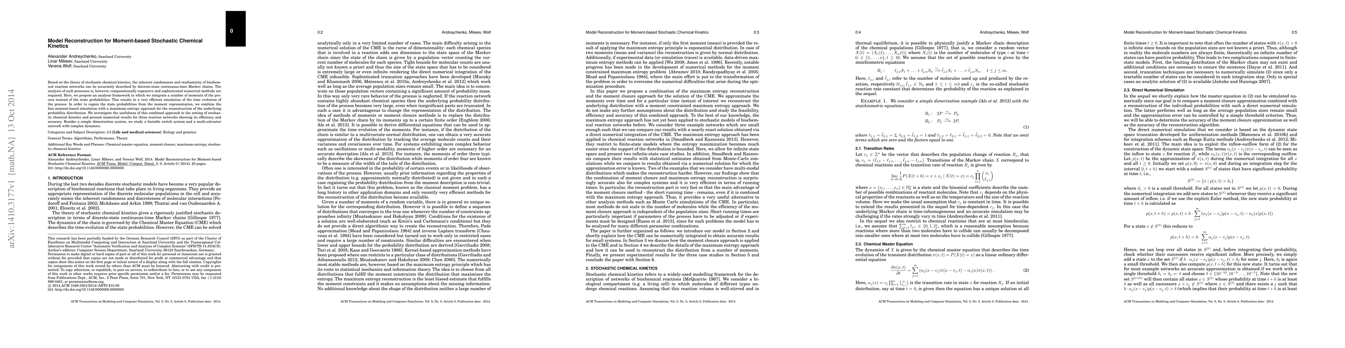This paper proposes a moment-based framework for efficiently simulating stochastic chemical kinetics using discrete-state continuous-time Markov chains. It combines fast moment-based simulation with a maximum entropy approach to reconstruct state probabilities, demonstrating efficiency and accuracy through numerical results on three reaction networks.