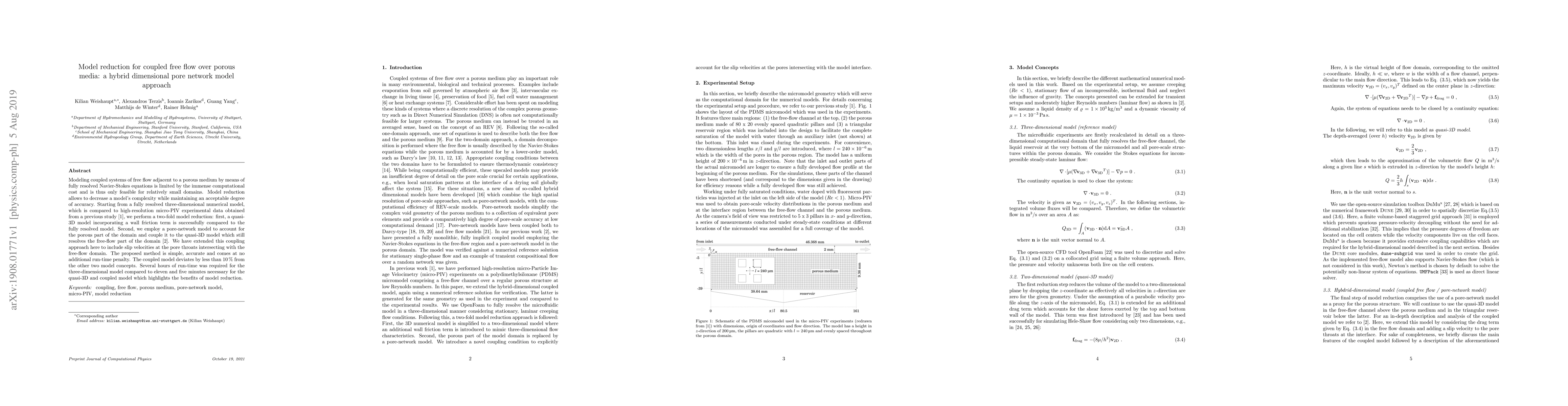 Modeling coupled systems of free flow adjacent to a porous medium by means of fully resolved Navier-Stokes equations is limited by the immense computational cost and is thus only feasible for relatively small domains. Model reduction allows to decrease a model's complexity while maintaining an acceptable degree of accuracy. Starting from a fully resolved three-dimensional numerical model, which is compared to high-resolution micro-PIV experimental data obtained from a previous study (Terzis et al.,2019), we perform a two-fold model reduction: first, a quasi-3D model incorporating a wall friction term is successfully compared to the fully resolved model. Second, we employ a pore-network model to account for the porous part of the domain and couple it to the quasi-3D model which still resolves the free-flow part of the domain (Weishaupt et al., 2019). We have extended this coupling approach here to include slip velocities at the pore throats intersecting with the free-flow domain. The proposed method is simple, accurate and comes at no additional run-time penalty. The coupled model deviates by less than 10 % from the other two model concepts. Several hours of run-time was required for the three-dimensional model compared to eleven and five minutes necessary for the quasi-3D and coupled model which highlights the benefits of model reduction.