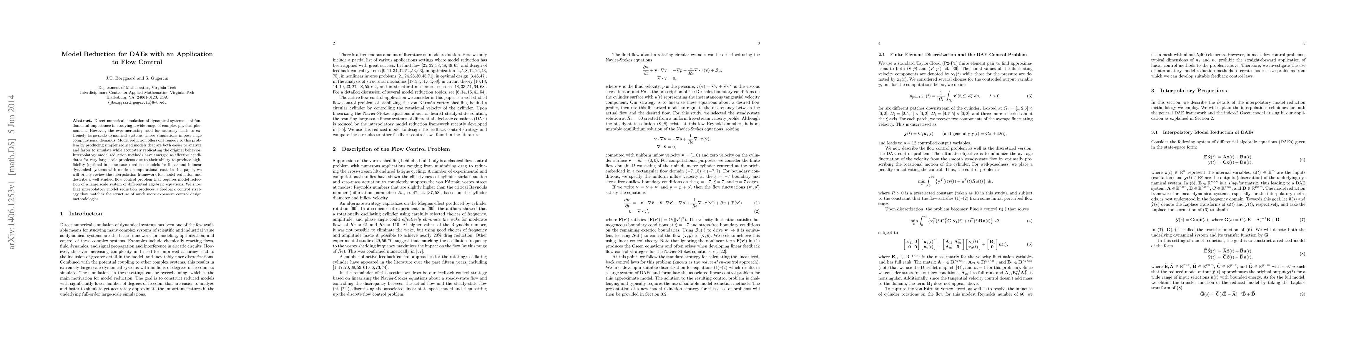 Direct numerical simulation of dynamical systems is of fundamental importance in studying a wide range of complex physical phenomena. However, the ever-increasing need for accuracy leads to extremely large-scale dynamical systems whose simulations impose huge computational demands. Model reduction offers one remedy to this problem by producing simpler reduced models that are both easier to analyze and faster to simulate while accurately replicating the original behavior. Interpolatory model reduction methods have emerged as effective candidates for very large-scale problems due to their ability to produce high-fidelity (optimal in some cases) reduced models for linear and bilinear dynamical systems with modest computational cost. In this paper, we will briefly review the interpolation framework for model reduction and describe a well studied flow control problem that requires model reduction of a large scale system of differential algebraic equations. We show that interpolatory model reduction produces a feedback control strategy that matches the structure of much more expensive control design methodologies.