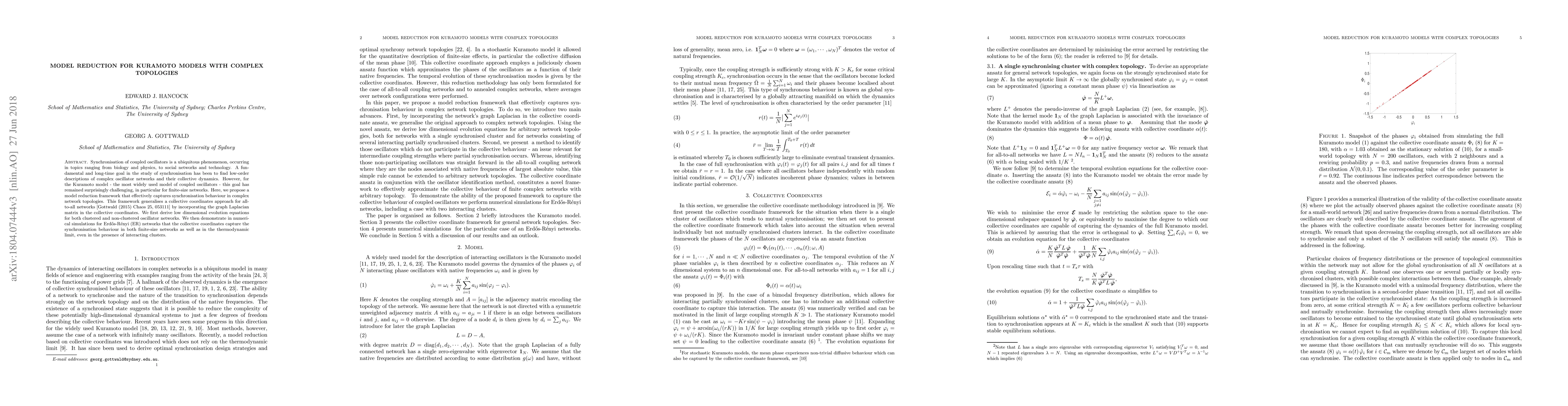 Synchronisation of coupled oscillators is a ubiquitous phenomenon, occurring in topics ranging from biology and physics, to social networks and technology. A fundamental and long-time goal in the study of synchronisation has been to find low-order descriptions of complex oscillator networks and their collective dynamics. However, for the Kuramoto model - the most widely used model of coupled oscillators - this goal has remained surprisingly challenging, in particular for finite-size networks. Here, we propose a model reduction framework that effectively captures synchronisation behaviour in complex network topologies. This framework generalises a collective coordinates approach for all-to-all networks [Gottwald (2015) Chaos 25, 053111] by incorporating the graph Laplacian matrix in the collective coordinates. We first derive low dimensional evolution equations for both clustered and non-clustered oscillator networks. We then demonstrate in numerical simulations for Erdos-Renyi (ER) networks that the collective coordinates capture the synchronisation behaviour in both finite-size networks as well as in the thermodynamic limit, even in the presence of interacting clusters.