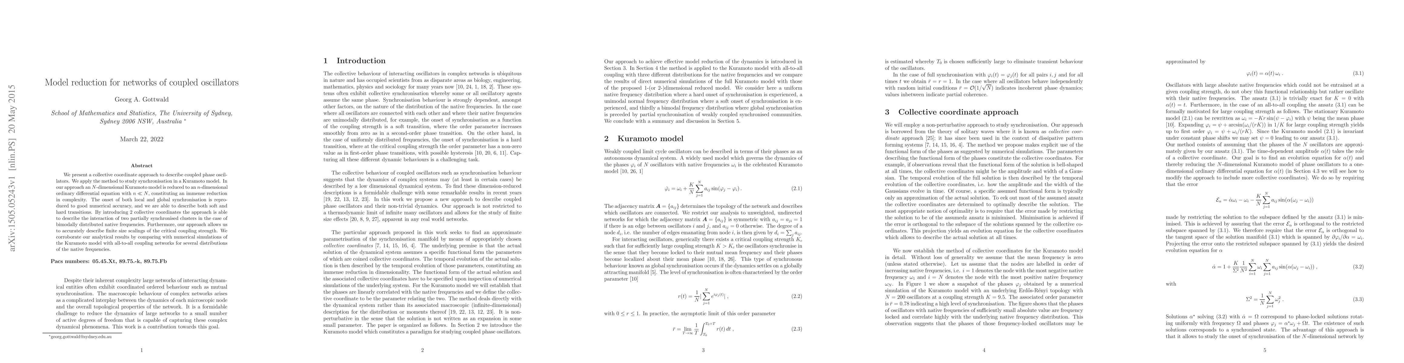 This paper proposes a collective coordinate method to reduce the complexity of N-dimensional Kuramoto models of coupled oscillators to n-dimensional ordinary differential equations, enabling accurate study of synchronisation and transition types. The approach is validated through comparison with numerical simulations.