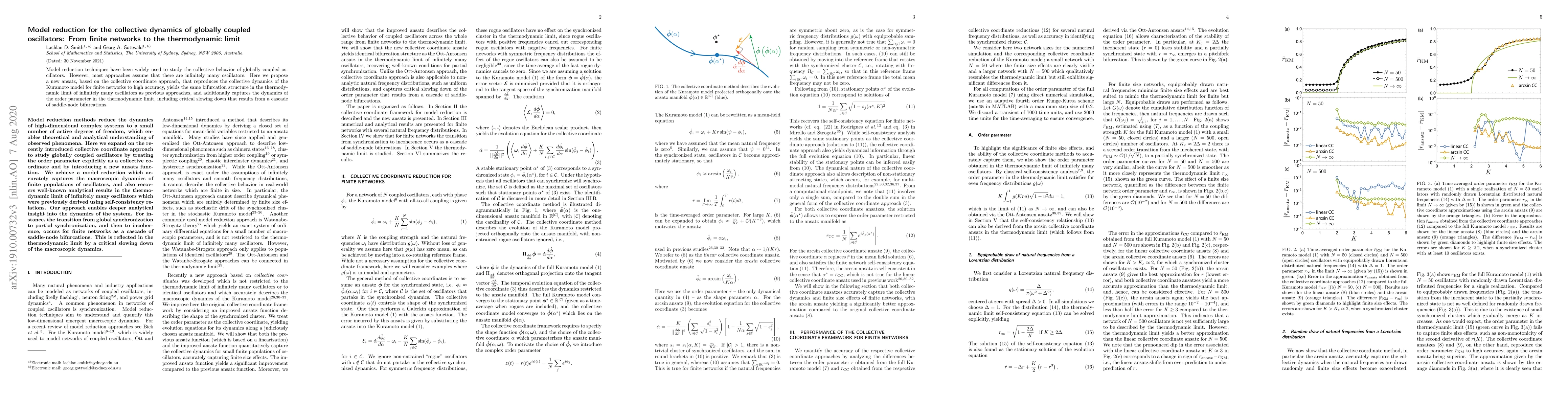 Model reduction techniques have been widely used to study the collective behavior of globally coupled oscillators. However, most approaches assume that there are infinitely many oscillators. Here we propose a new ansatz, based on the collective coordinate approach, that reproduces the collective dynamics of the Kuramoto model for finite networks to high accuracy, yields the same bifurcation structure in the thermodynamic limit of infinitely many oscillators as previous approaches, and additionally captures the dynamics of the order parameter in the thermodynamic limit, including critical slowing down that results from a cascade of saddle-node bifurcations.