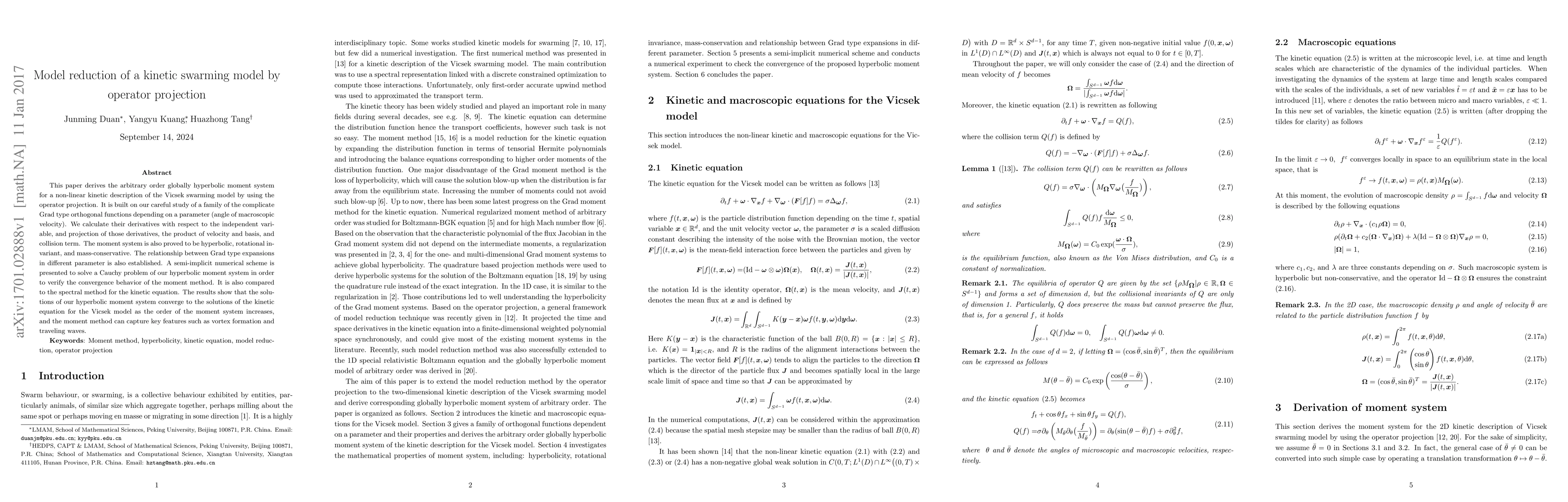 This paper derives the arbitrary order globally hyperbolic moment system for a non-linear kinetic description of the Vicsek swarming model by using the operator projection. It is built on our careful study of a family of the complicate Grad type orthogonal functions depending on a parameter (angle of macroscopic velocity). We calculate their derivatives with respect to the independent vari- able, and projection of those derivatives, the product of velocity and basis, and collision term. The moment system is also proved to be hyperbolic, rotational invariant, and mass-conservative. The relationship between Grad type expansions in different parameter is also established. A semi-implicit numerical scheme is presented to solve a Cauchy problem of our hyperbolic moment system in order to verify the convergence behavior of the moment method. It is also compared to the spectral method for the kinetic equation. The results show that the solutions of our hyperbolic moment system converge to the solutions of the kinetic equation for the Vicsek model as the order of the moment system increases, and the moment method can capture key features such as rarefaction and shock waves, contact discontinuity, and vortex formation.