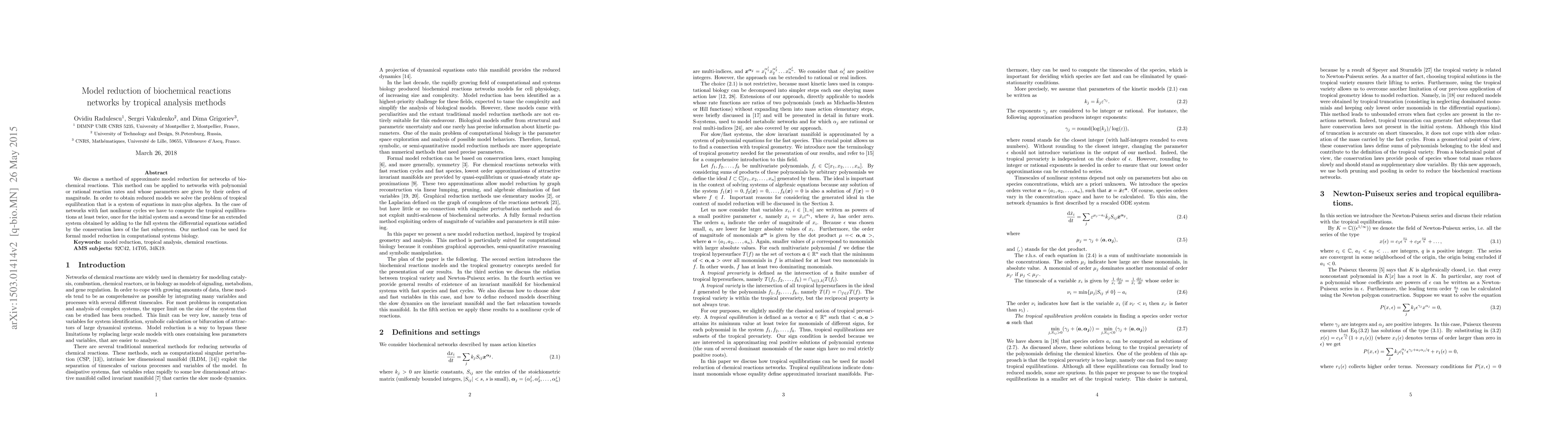We discuss a method of approximate model reduction for networks of biochemical reactions. This method can be applied to networks with polynomial or rational reaction rates and whose parameters are given by their orders of magnitude. In order to obtain reduced models we solve the problem of tropical equilibration that is a system of equations in max-plus algebra. In the case of networks with nonlinear fast cycles we have to solve the problem of tropical equilibration at least twice, once for the initial system and a second time for an extended system obtained by adding to the initial system the differential equations satisfied by the conservation laws of the fast subsystem. The two steps can be reiterated until the fast subsystem has no conservation laws different from the ones of the full model. Our method can be used for formal model reduction in computational systems biology.