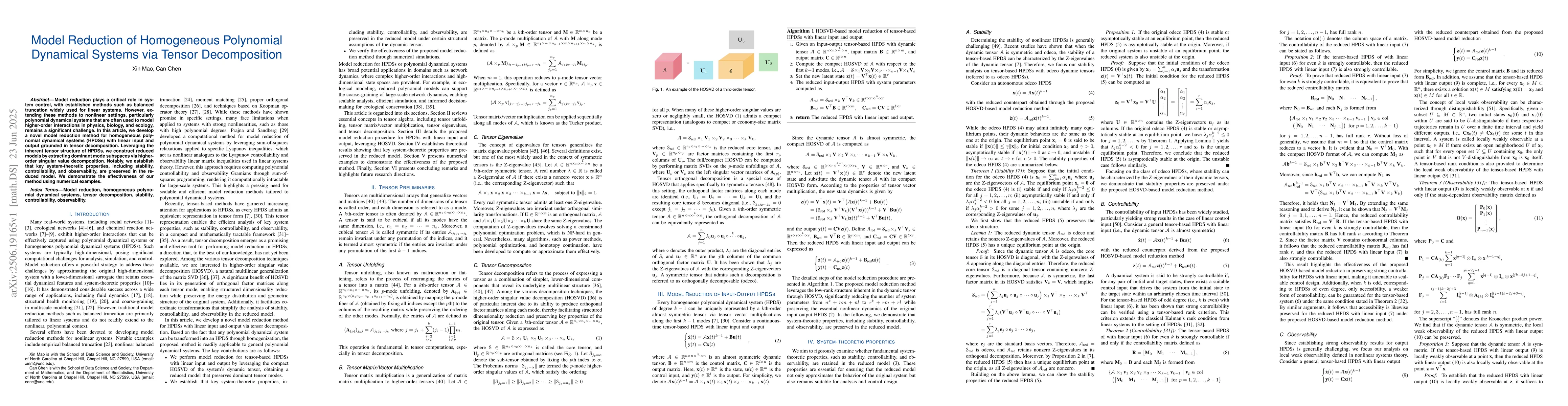 Model reduction plays a critical role in system control, with established methods such as balanced truncation widely used for linear systems. However, extending these methods to nonlinear settings, particularly polynomial dynamical systems that are often used to model higher-order interactions in physics, biology, and ecology, remains a significant challenge. In this article, we develop a novel model reduction method for homogeneous polynomial dynamical systems (HPDSs) with linear input and output grounded in tensor decomposition. Leveraging the inherent tensor structure of HPDSs, we construct reduced models by extracting dominant mode subspaces via higher-order singular value decomposition. Notably, we establish that key system-theoretic properties, including stability, controllability, and observability, are preserved in the reduced model. We demonstrate the effectiveness of our method using numerical examples.