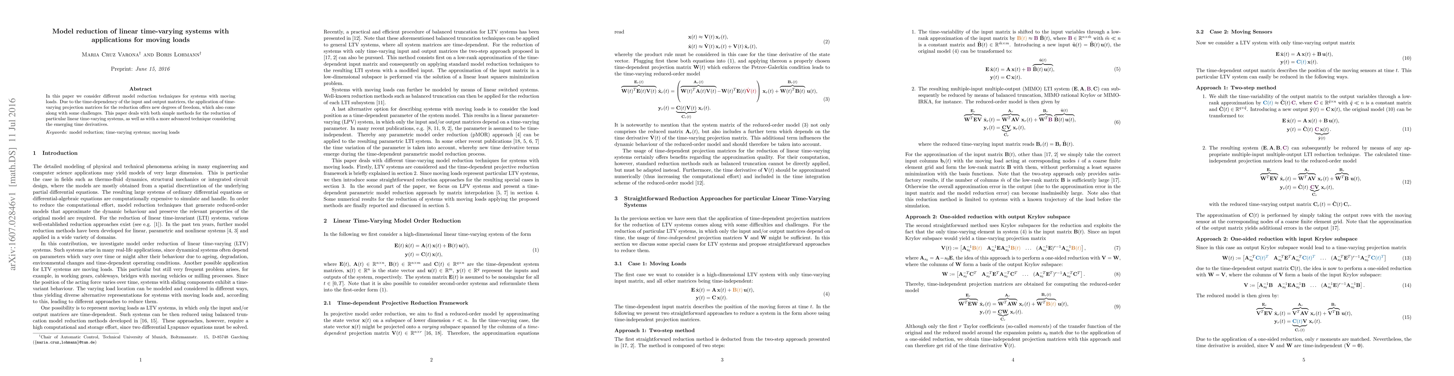 In this paper we consider different model reduction techniques for systems with moving loads. Due to the time-dependency of the input and output matrices, the application of time-varying projection matrices for the reduction offers new degrees of freedom, which also come along with some challenges. This paper deals with both simple methods for the reduction of particular linear time-varying systems, as well as with a more advanced technique considering the emerging time derivatives.