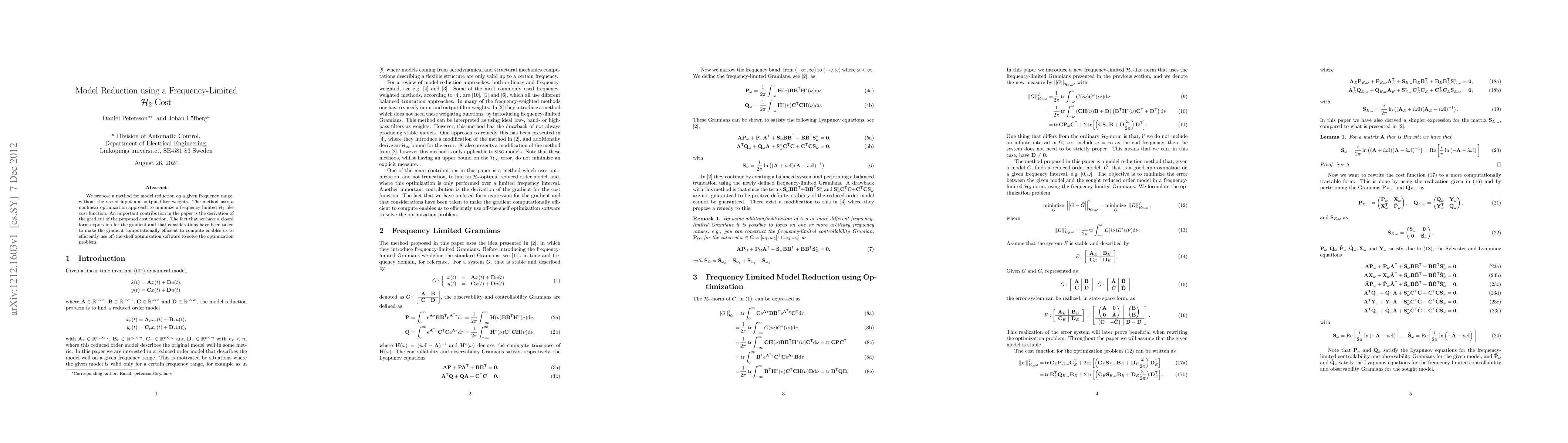 This research introduces a novel model reduction method that optimizes within a specific frequency range using a frequency-limited H2-cost, eliminating the need for input/output filter weights. The approach employs a gradient-based optimization, facilitated by a computationally efficient closed-form gradient expression, allowing for effective use of standard optimization software.