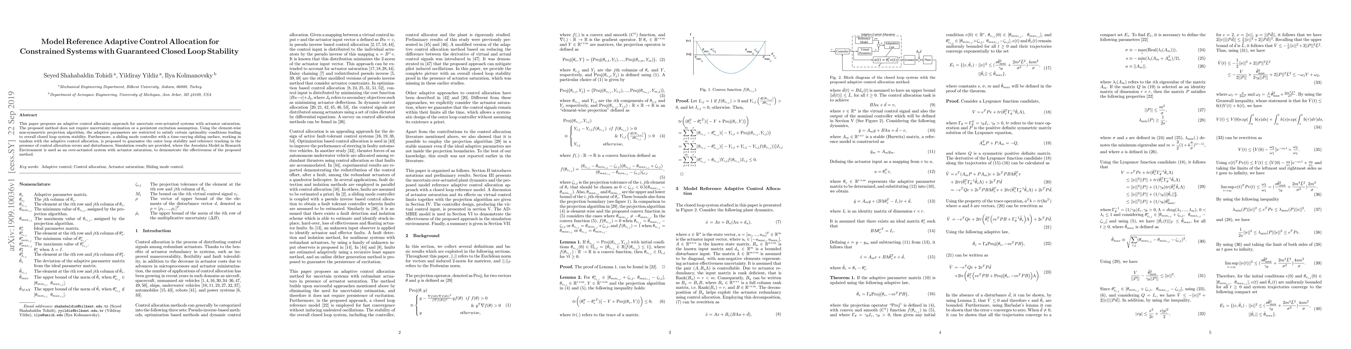 This paper introduces an adaptive control allocation method for uncertain over-actuated systems with actuator saturation, ensuring closed-loop stability without requiring uncertainty estimation. The method employs a non-symmetric projection algorithm and a sliding mode controller to guarantee stability and reference tracking.