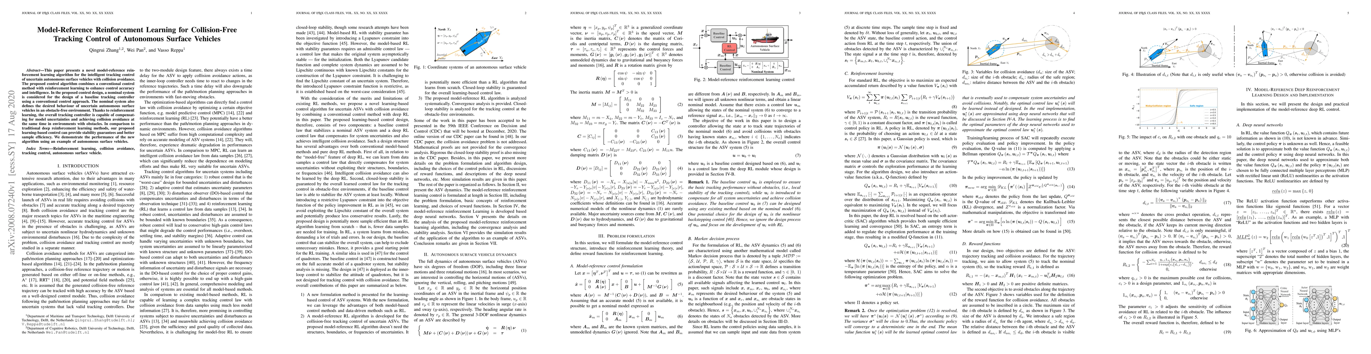 This paper introduces a model-reference reinforcement learning algorithm for collision-free tracking control of autonomous surface vehicles, combining conventional control with reinforcement learning to enhance accuracy and intelligence. The proposed method ensures stability and better sample efficiency compared to traditional deep reinforcement learning.