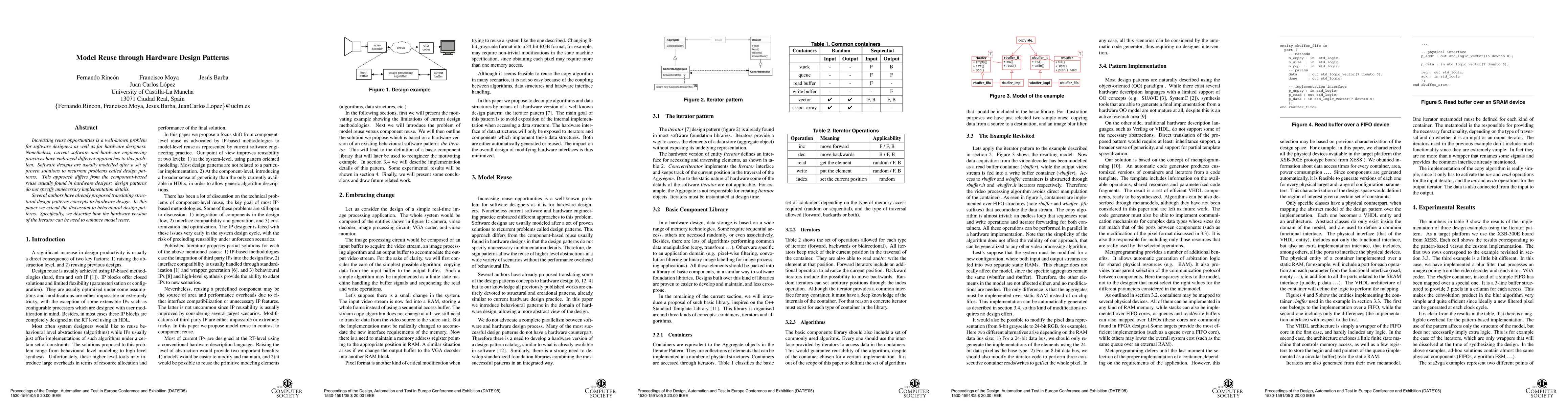 Increasing reuse opportunities is a well-known problem for software designers as well as for hardware designers. Nonetheless, current software and hardware engineering practices have embraced different approaches to this problem. Software designs are usually modelled after a set of proven solutions to recurrent problems called design patterns. This approach differs from the component-based reuse usually found in hardware designs: design patterns do not specify unnecessary implementation details. Several authors have already proposed translating structural design patterns concepts to hardware design. In this paper we extend the discussion to behavioural design patterns. Specifically, we describe how the hardware version of the Iterator can be used to enhance model reuse.