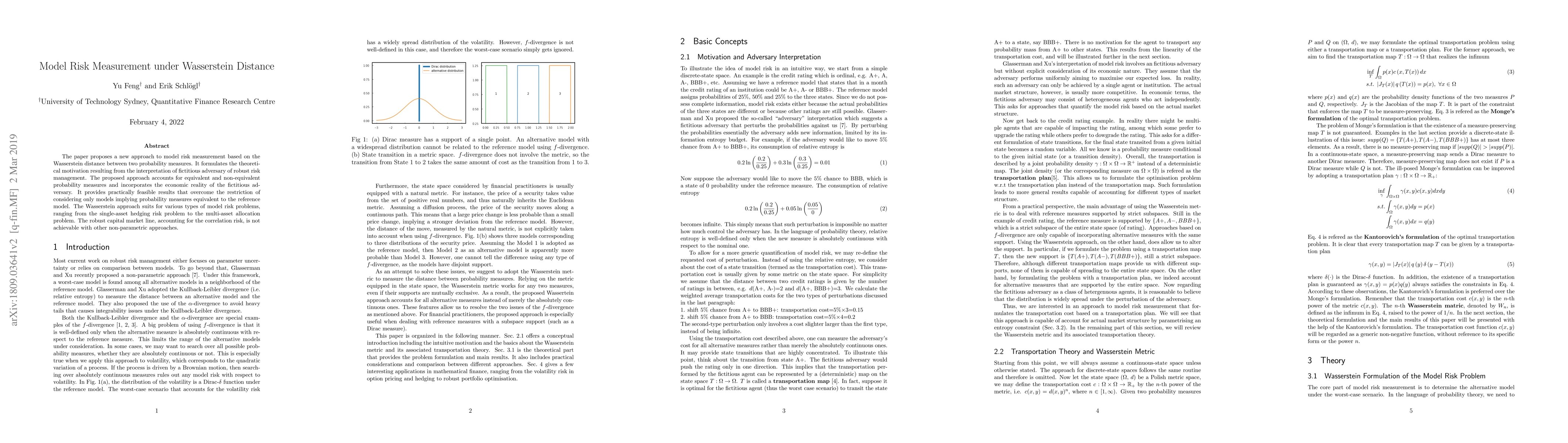 The paper proposes a new approach to model risk measurement based on the Wasserstein distance between two probability measures. It formulates the theoretical motivation resulting from the interpretation of fictitious adversary of robust risk management. The proposed approach accounts for equivalent and non-equivalent probability measures and incorporates the economic reality of the fictitious adversary. It provides practically feasible results that overcome the restriction of considering only models implying probability measures equivalent to the reference model. The Wasserstein approach suits for various types of model risk problems, ranging from the single-asset hedging risk problem to the multi-asset allocation problem. The robust capital market line, accounting for the correlation risk, is not achievable with other non-parametric approaches.