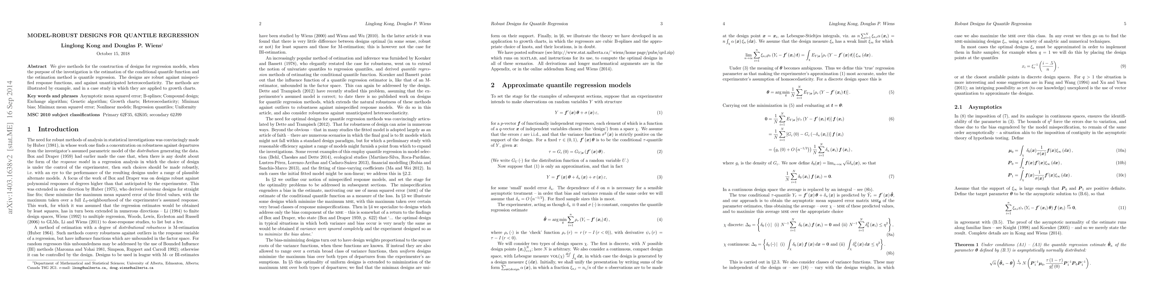 We give methods for the construction of designs for linear models, when the purpose of the investigation is the estimation of the conditional quantile function and the estimation method is quantile regression. The designs are robust against misspecified response functions, and against unanticipated heteroscedasticity. The methods are illustrated by example, and in a case study in which they are applied to growth charts.