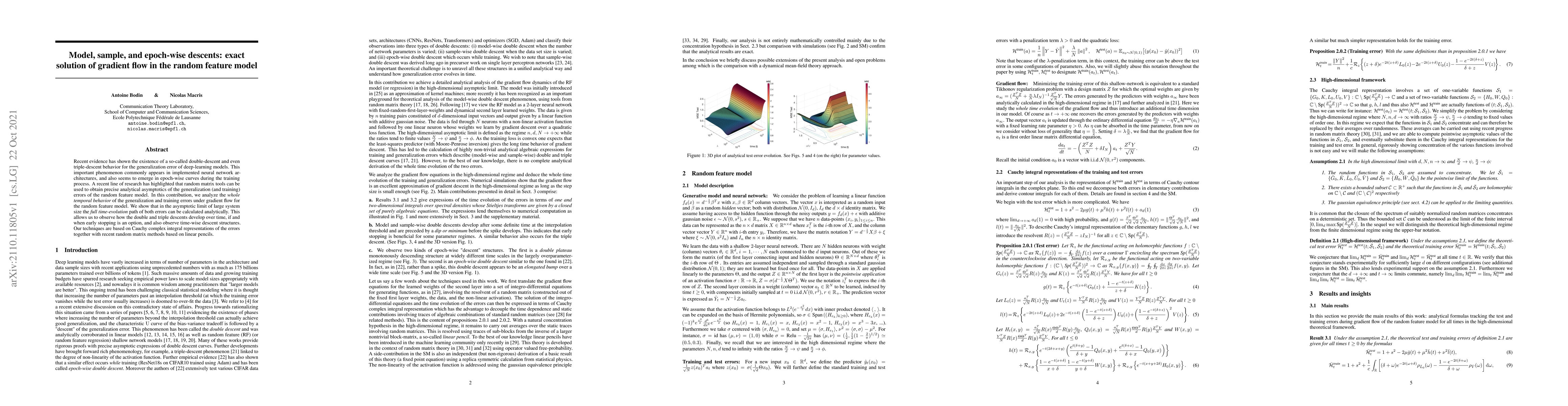 Recent evidence has shown the existence of a so-called double-descent and even triple-descent behavior for the generalization error of deep-learning models. This important phenomenon commonly appears in implemented neural network architectures, and also seems to emerge in epoch-wise curves during the training process. A recent line of research has highlighted that random matrix tools can be used to obtain precise analytical asymptotics of the generalization (and training) errors of the random feature model. In this contribution, we analyze the whole temporal behavior of the generalization and training errors under gradient flow for the random feature model. We show that in the asymptotic limit of large system size the full time-evolution path of both errors can be calculated analytically. This allows us to observe how the double and triple descents develop over time, if and when early stopping is an option, and also observe time-wise descent structures. Our techniques are based on Cauchy complex integral representations of the errors together with recent random matrix methods based on linear pencils.