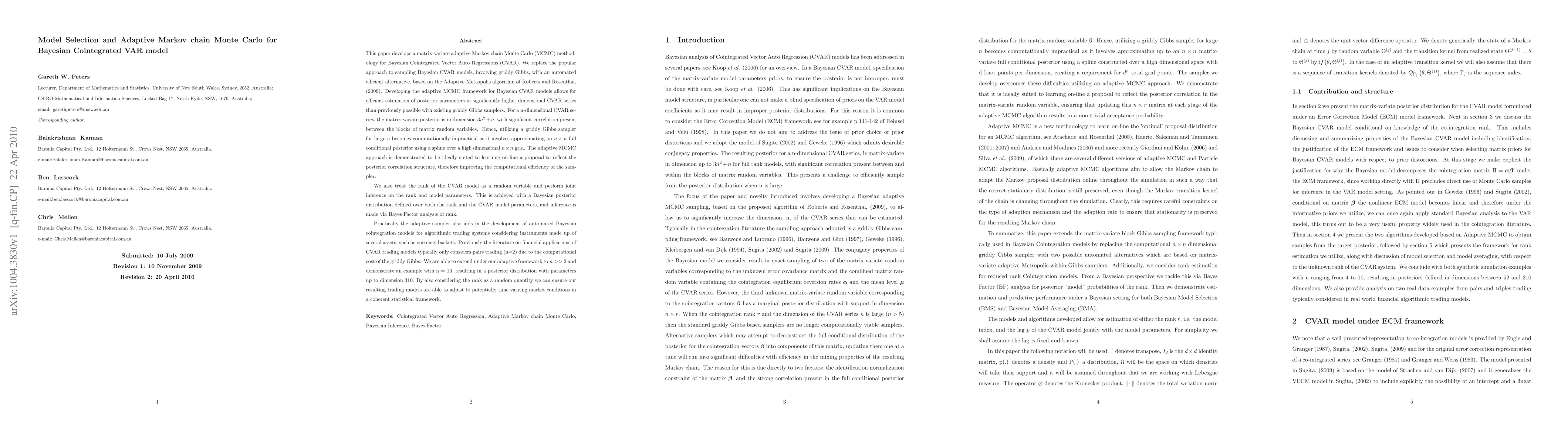This paper develops a matrix-variate adaptive Markov chain Monte Carlo (MCMC) methodology for Bayesian Cointegrated Vector Auto Regressions (CVAR). We replace the popular approach to sampling Bayesian CVAR models, involving griddy Gibbs, with an automated efficient alternative, based on the Adaptive Metropolis algorithm of Roberts and Rosenthal, (2009). Developing the adaptive MCMC framework for Bayesian CVAR models allows for efficient estimation of posterior parameters in significantly higher dimensional CVAR series than previously possible with existing griddy Gibbs samplers. For a n-dimensional CVAR series, the matrix-variate posterior is in dimension $3n^2 + n$, with significant correlation present between the blocks of matrix random variables. We also treat the rank of the CVAR model as a random variable and perform joint inference on the rank and model parameters. This is achieved with a Bayesian posterior distribution defined over both the rank and the CVAR model parameters, and inference is made via Bayes Factor analysis of rank. Practically the adaptive sampler also aids in the development of automated Bayesian cointegration models for algorithmic trading systems considering instruments made up of several assets, such as currency baskets. Previously the literature on financial applications of CVAR trading models typically only considers pairs trading (n=2) due to the computational cost of the griddy Gibbs. We are able to extend under our adaptive framework to $n >> 2$ and demonstrate an example with n = 10, resulting in a posterior distribution with parameters up to dimension 310. By also considering the rank as a random quantity we can ensure our resulting trading models are able to adjust to potentially time varying market conditions in a coherent statistical framework.