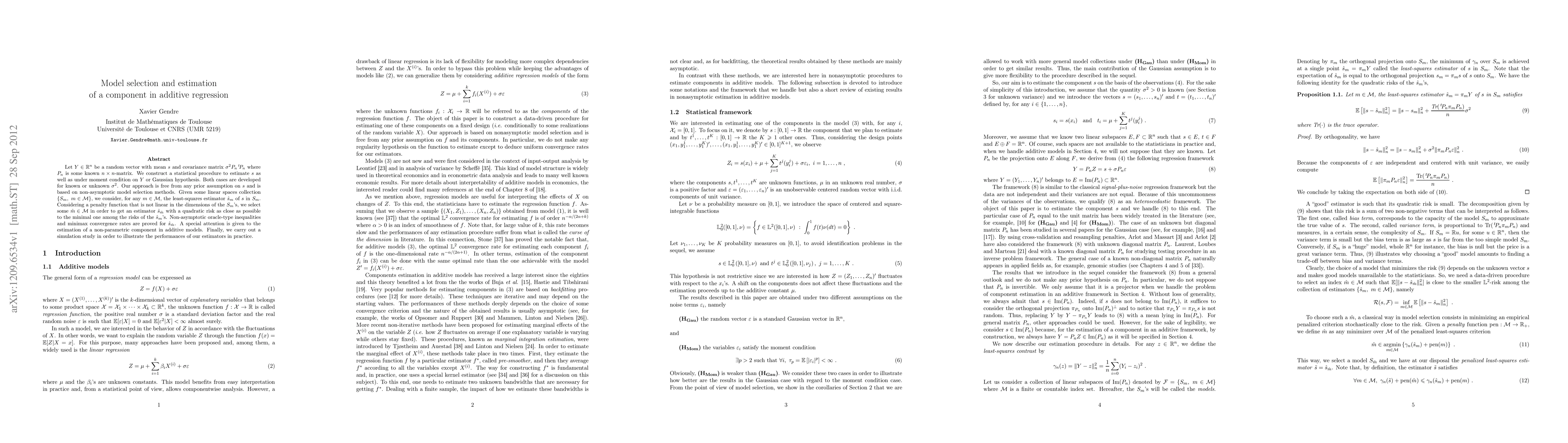Let $Y\in\R^n$ be a random vector with mean $s$ and covariance matrix $\sigma^2P_n\tra{P_n}$ where $P_n$ is some known $n\times n$-matrix. We construct a statistical procedure to estimate $s$ as well as under moment condition on $Y$ or Gaussian hypothesis. Both cases are developed for known or unknown $\sigma^2$. Our approach is free from any prior assumption on $s$ and is based on non-asymptotic model selection methods. Given some linear spaces collection $\{S_m,\ m\in\M\}$, we consider, for any $m\in\M$, the least-squares estimator $\hat{s}_m$ of $s$ in $S_m$. Considering a penalty function that is not linear in the dimensions of the $S_m$'s, we select some $\hat{m}\in\M$ in order to get an estimator $\hat{s}_{\hat{m}}$ with a quadratic risk as close as possible to the minimal one among the risks of the $\hat{s}_m$'s. Non-asymptotic oracle-type inequalities and minimax convergence rates are proved for $\hat{s}_{\hat{m}}$. A special attention is given to the estimation of a non-parametric component in additive models. Finally, we carry out a simulation study in order to illustrate the performances of our estimators in practice.