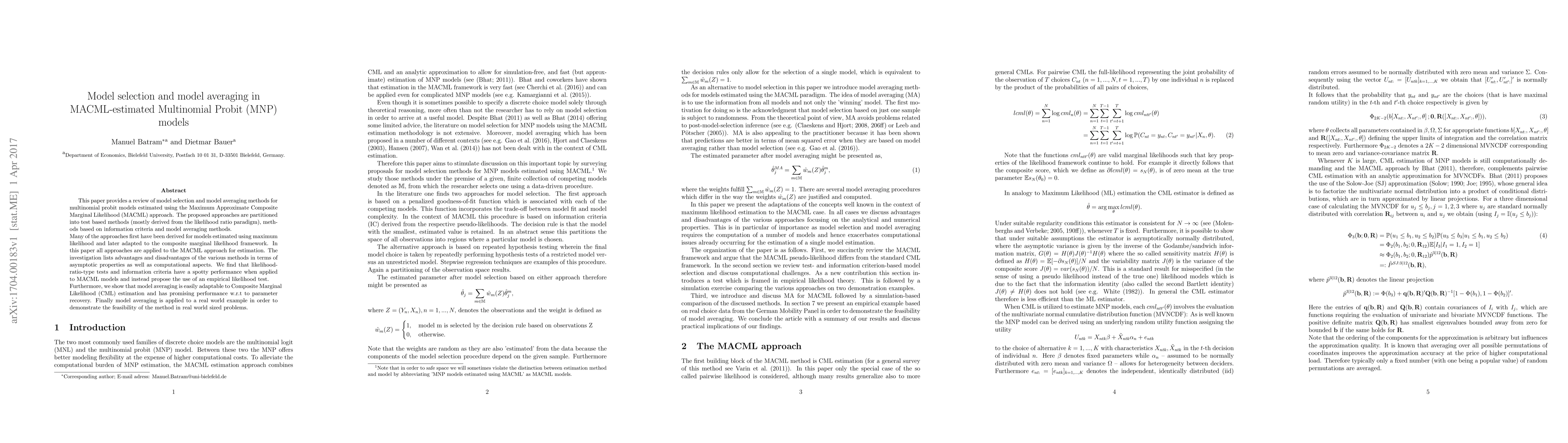 This paper provides a review of model selection and model averaging methods for multinomial probit models estimated using the MACML approach. The proposed approaches are partitioned into test based methods (mostly derived from the likelihood ratio paradigm), methods based on information criteria and model averaging methods. Many of the approaches first have been derived for models estimated using maximum likelihood and later adapted to the composite marginal likelihood framework. In this paper all approaches are applied to the MACML approach for estimation. The investigation lists advantages and disadvantages of the various methods in terms of asymptotic properties as well as computational aspects. We find that likelihood-ratio-type tests and information criteria have a spotty performance when applied to MACML models and instead propose the use of an empirical likelihood test. Furthermore, we show that model averaging is easily adaptable to CML estimation and has promising performance w.r.t to parameter recovery. Finally model averaging is applied to a real world example in order to demonstrate the feasibility of the method in real world sized problems.