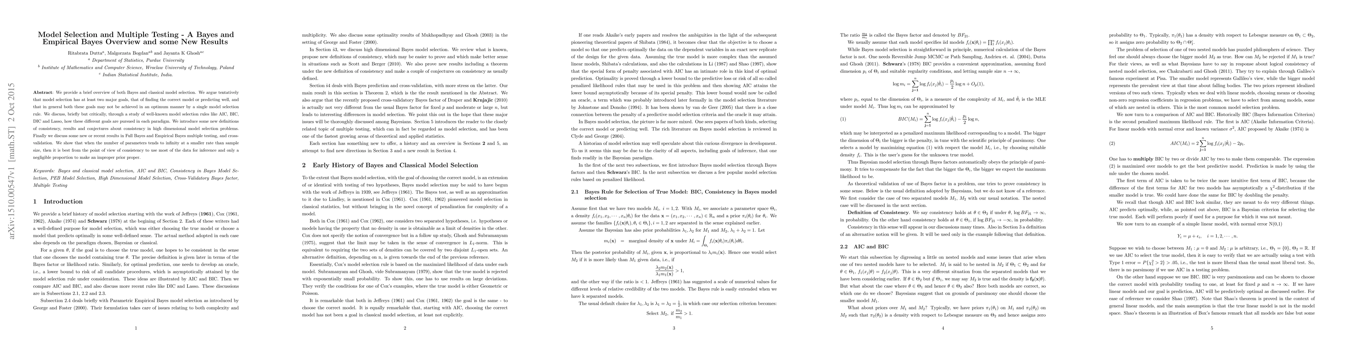 We provide a brief overview of both Bayes and classical model selection. We argue tentatively that model selection has at least two major goals, that of finding the correct model or predicting well, and that in general both these goals may not be achieved in an optimum manner by a single model selection rule. We discuss, briefly but critically, through a study of well-known model selection rules like AIC, BIC, DIC and Lasso, how these different goals are pursued in each paradigm. We introduce some new definitions of consistency, results and conjectures about consistency in high dimensional model selection problems. Finally we discuss some new or recent results in Full Bayes and Empirical Bayes multiple testing, and cross-validation. We show that when the number of parameters tends to infinity at a smaller rate than sample size, then it is best from the point of view of consistency to use most of the data for inference and only a negligible proportion to make an improper prior proper.