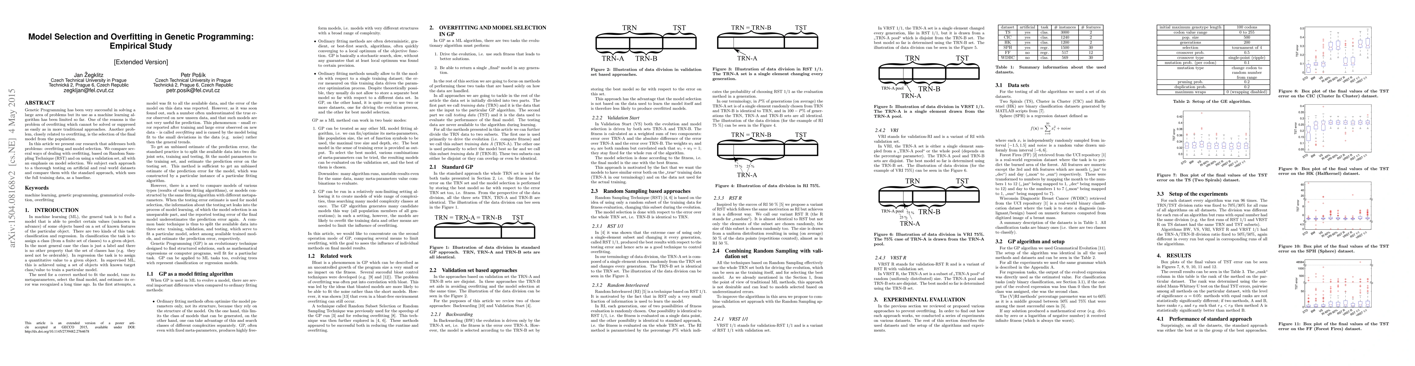 Genetic Programming has been very successful in solving a large area of problems but its use as a machine learning algorithm has been limited so far. One of the reasons is the problem of overfitting which cannot be solved or suppresed as easily as in more traditional approaches. Another problem, closely related to overfitting, is the selection of the final model from the population. In this article we present our research that addresses both problems: overfitting and model selection. We compare several ways of dealing with ovefitting, based on Random Sampling Technique (RST) and on using a validation set, all with an emphasis on model selection. We subject each approach to a thorough testing on artificial and real--world datasets and compare them with the standard approach, which uses the full training data, as a baseline.