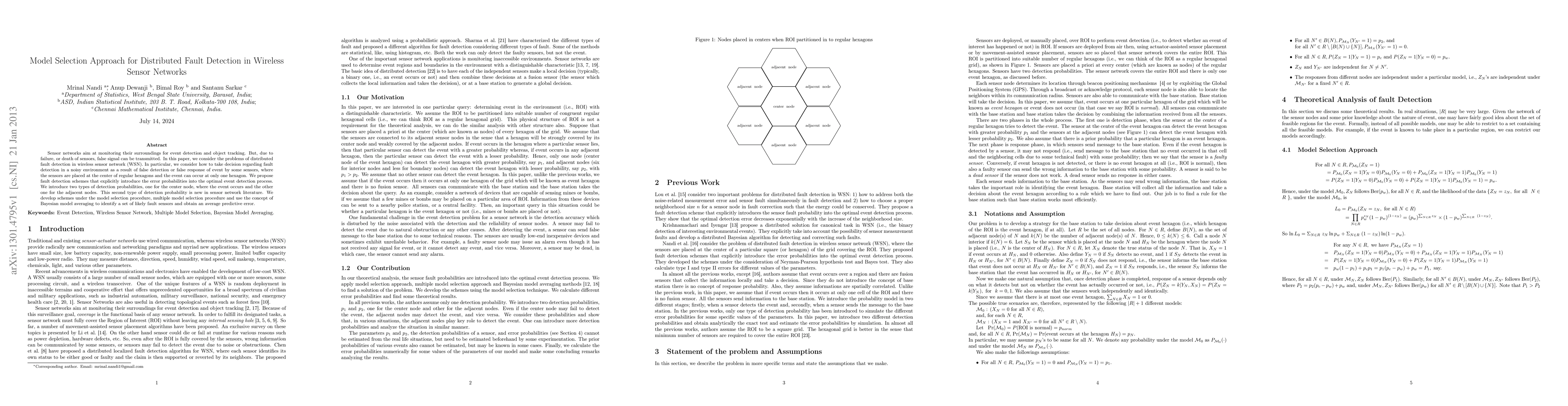 Sensor networks aim at monitoring their surroundings for event detection and object tracking. But, due to failure, or death of sensors, false signal can be transmitted. In this paper, we consider the problems of distributed fault detection in wireless sensor network (WSN). In particular, we consider how to take decision regarding fault detection in a noisy environment as a result of false detection or false response of event by some sensors, where the sensors are placed at the center of regular hexagons and the event can occur at only one hexagon. We propose fault detection schemes that explicitly introduce the error probabilities into the optimal event detection process. We introduce two types of detection probabilities, one for the center node, where the event occurs and the other one for the adjacent nodes. This second type of detection probability is new in sensor network literature. We develop schemes under the model selection procedure, multiple model selection procedure and use the concept of Bayesian model averaging to identify a set of likely fault sensors and obtain an average predictive error.