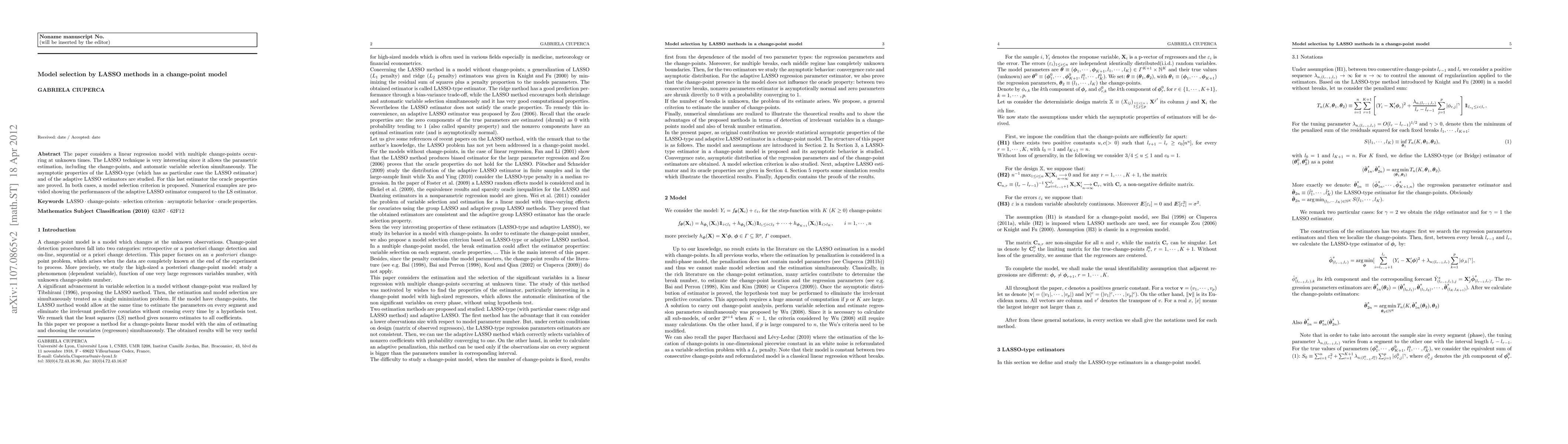 This paper uses LASSO methods to select a linear regression model with multiple change-points at unknown times, offering parametric estimation and automatic variable selection simultaneously.
